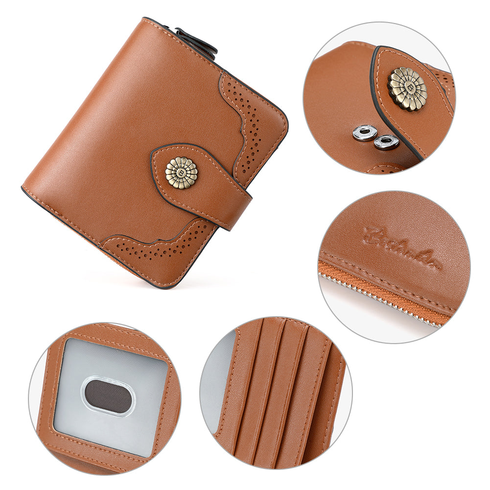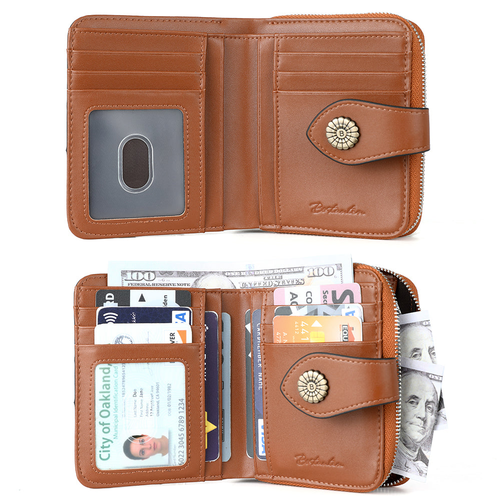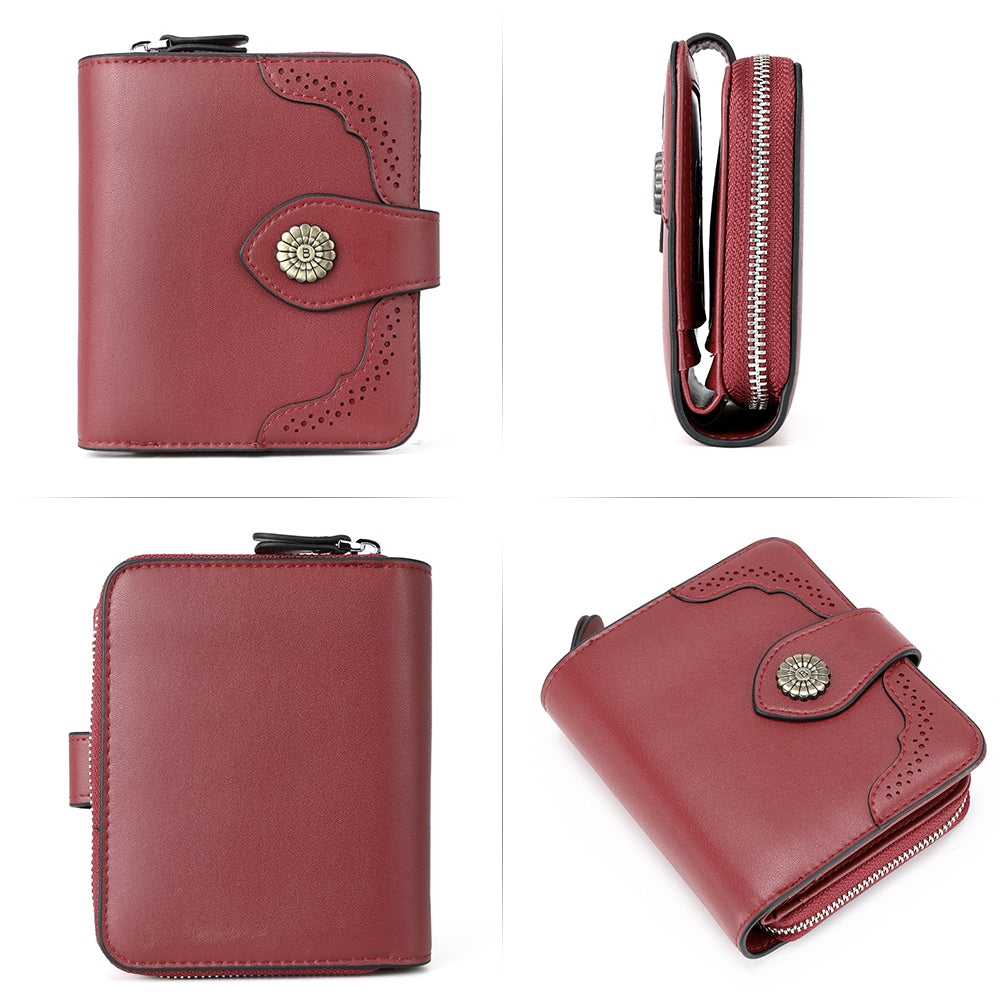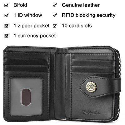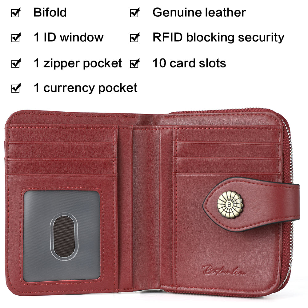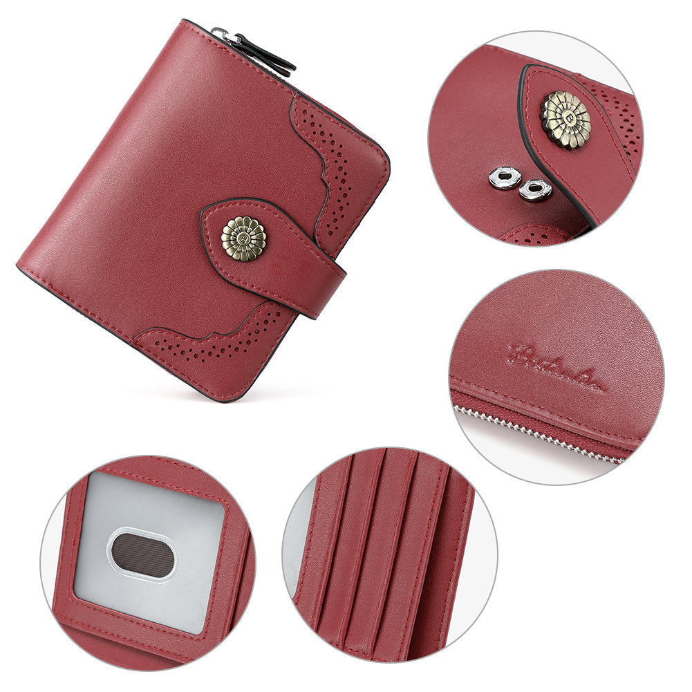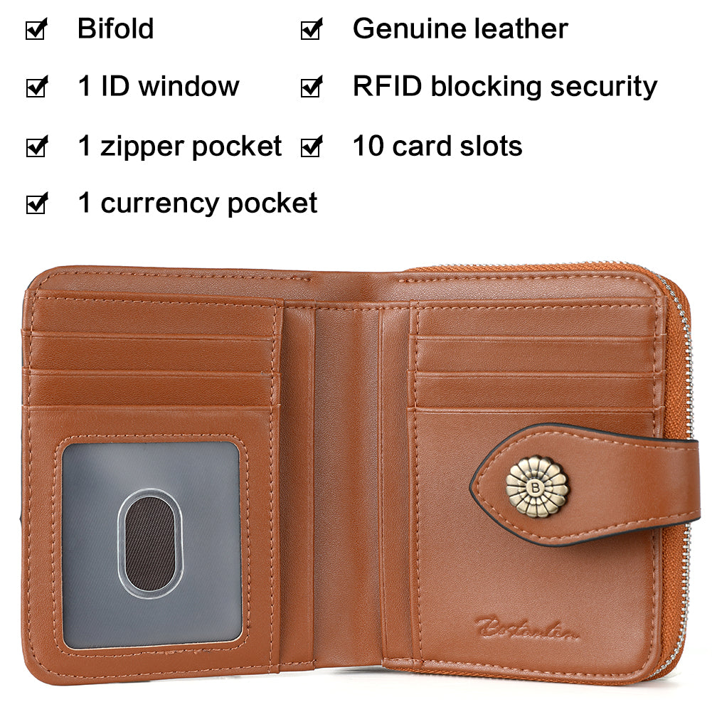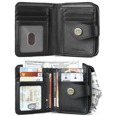 Unique Features -- Roomy zipper pocket at the back. U-shape silver-color metal zipper around runs smoothly when being pulled open. You can put keys, coins and other tiny things in there. Two buttons closure designs make it stays closed and firm when stuffed. Best choice for avoiding bulky looking wallets.