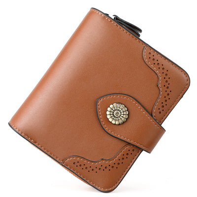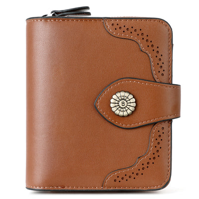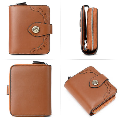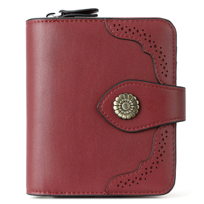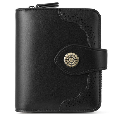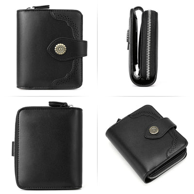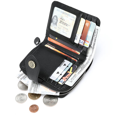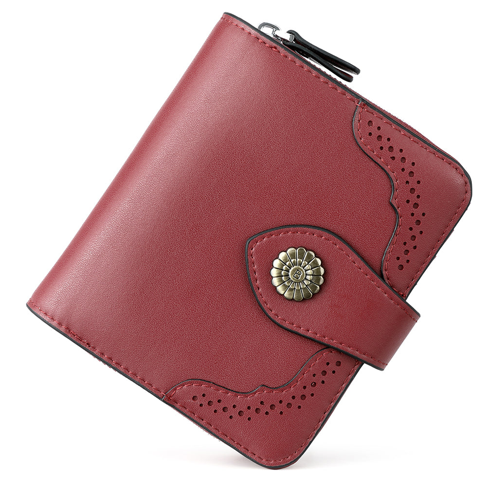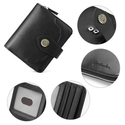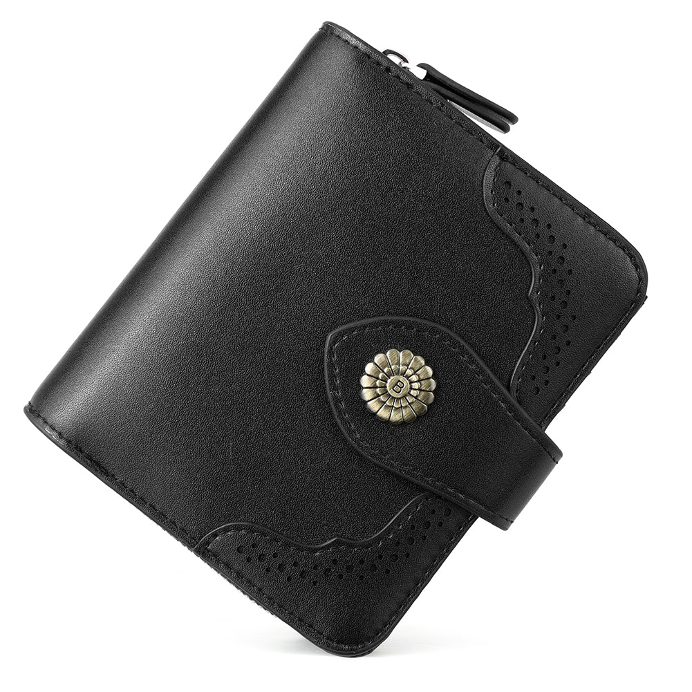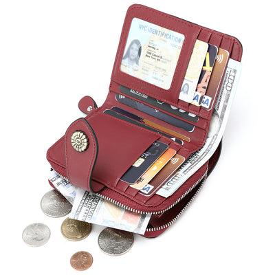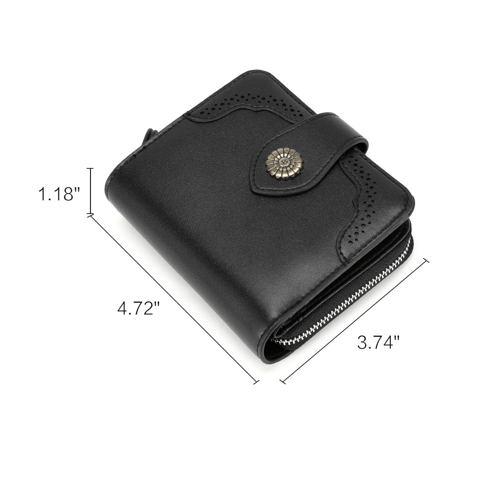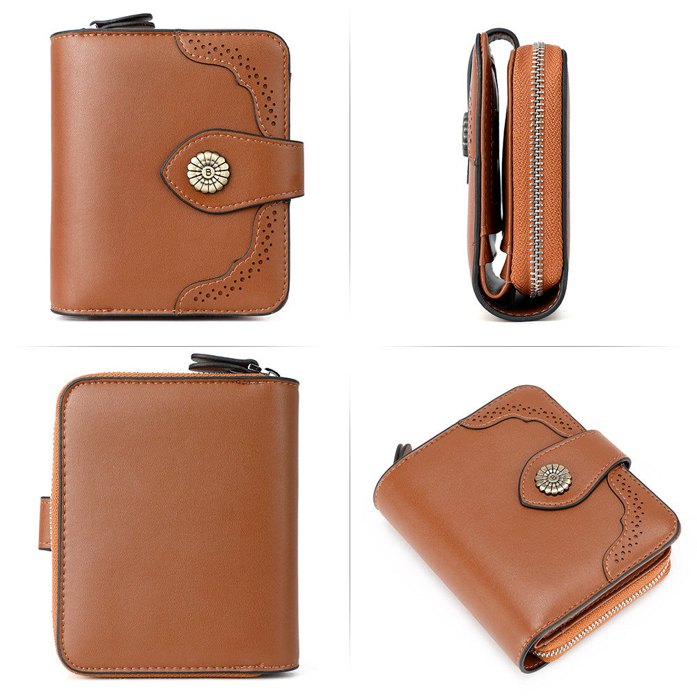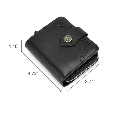 Unique Features -- Roomy zipper pocket at the back. U-shape silver-color metal zipper around runs smoothly when being pulled open. You can put keys, coins and other tiny things in there. Two buttons closure designs make it stays closed and firm when stuffed. Best choice for avoiding bulky looking wallets.