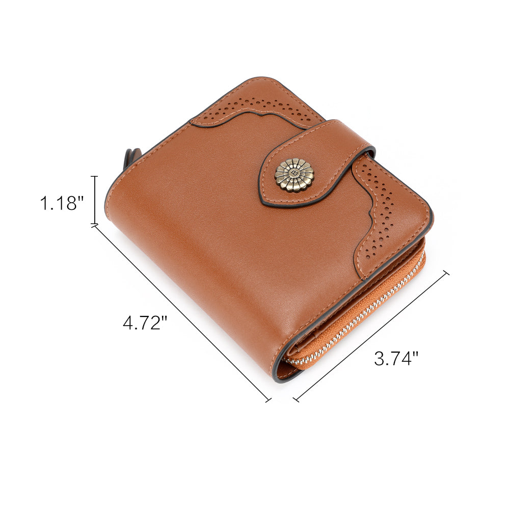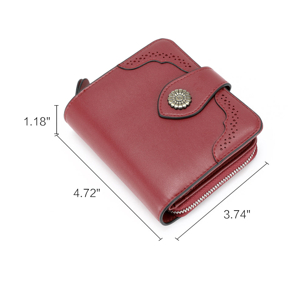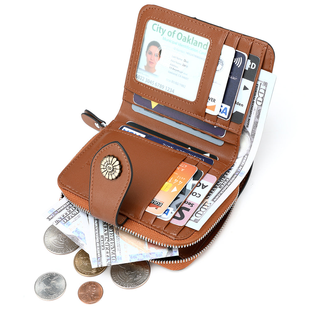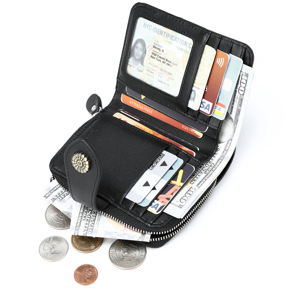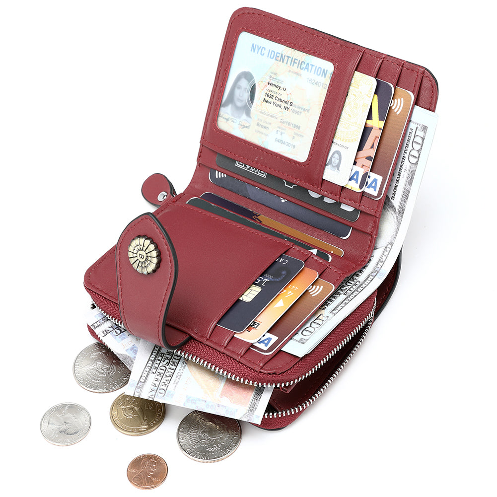Functional Design -- 4.92" x 4.13" x 1.18" in. Weight: 0.13Kg. As the bill section can hold up 30 pieces of dollar bills. Comes With 9 Credit card slots and 1 ID window, 1 coin zipper pocket, 1 full-length compartment to put money, 1 removable card sleeve has 1 card slot and 1 ID window. Roomy enough for fitting plenty of cards, change and dollar bills, coins, keep them well organized.