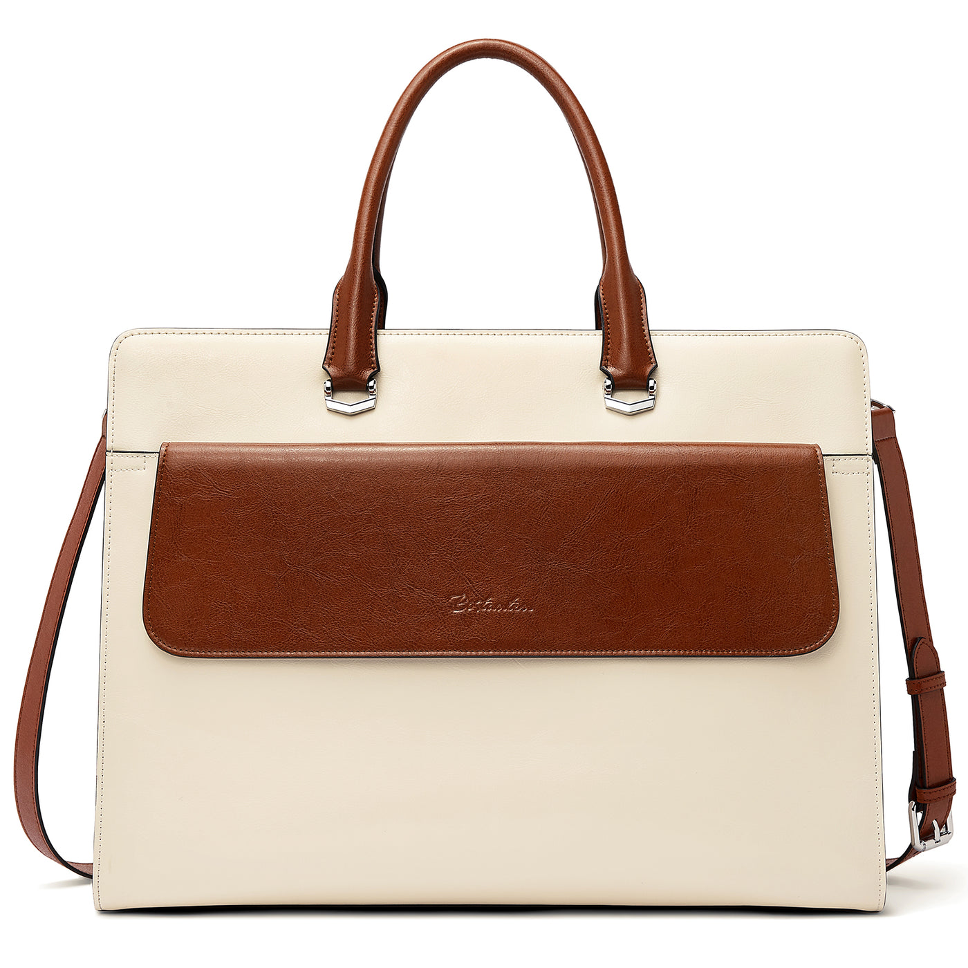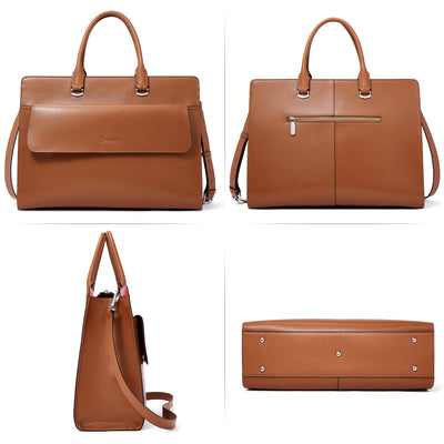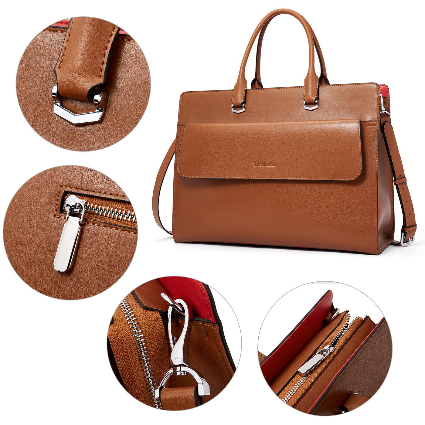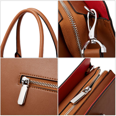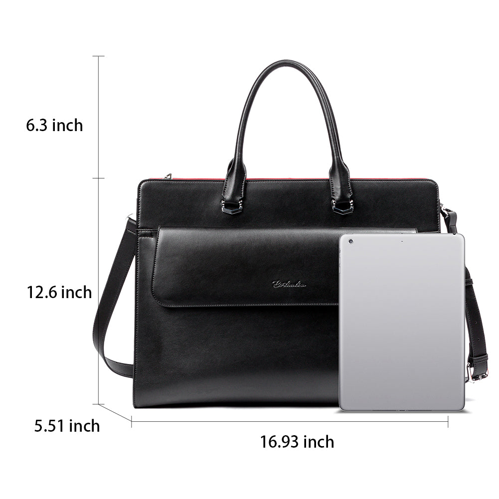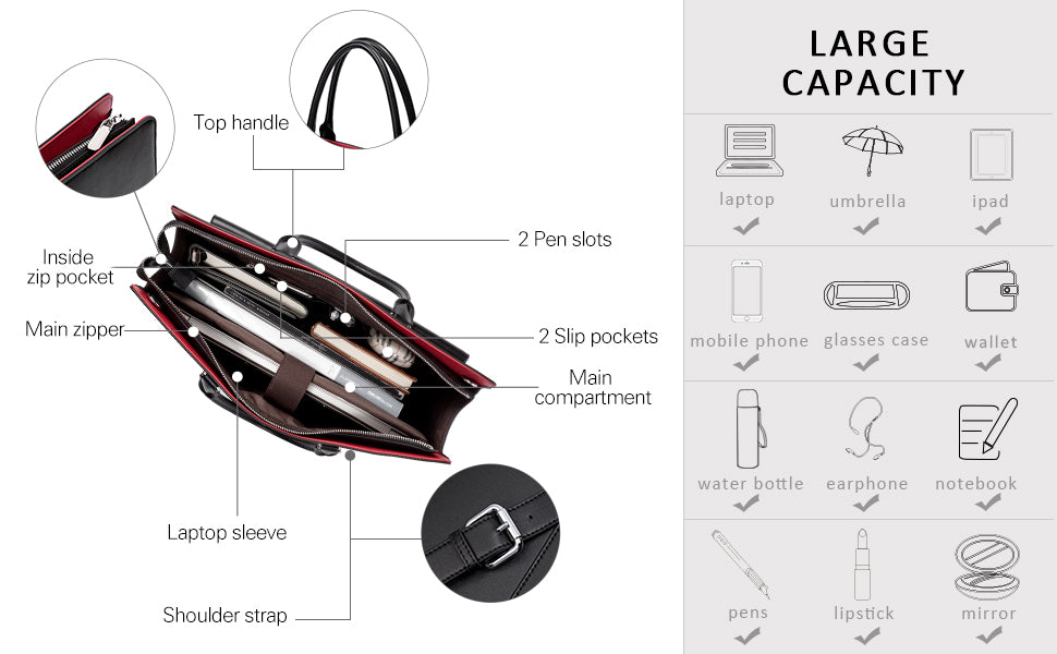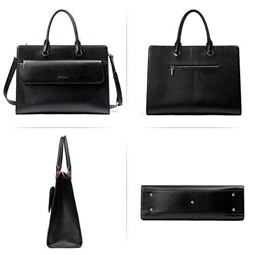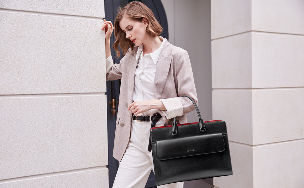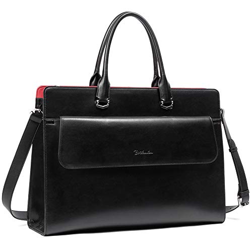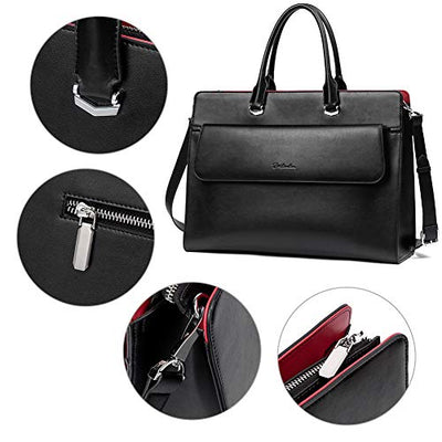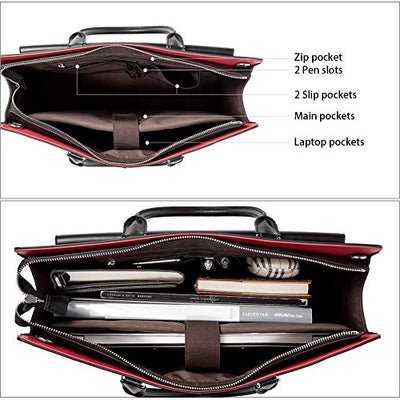 Chic 15.6 Inch Laptop Bag for Women -- Fashionable black-red styling combined with flapover front magnetic pocket in our leather briefcase. Easy to hold necessities in workplaces. Suitable for various identities such as business persons, teachers, professors, students, designers, analysts, or laptop bag fans! Great and life-friendly to carry whenever on the go.