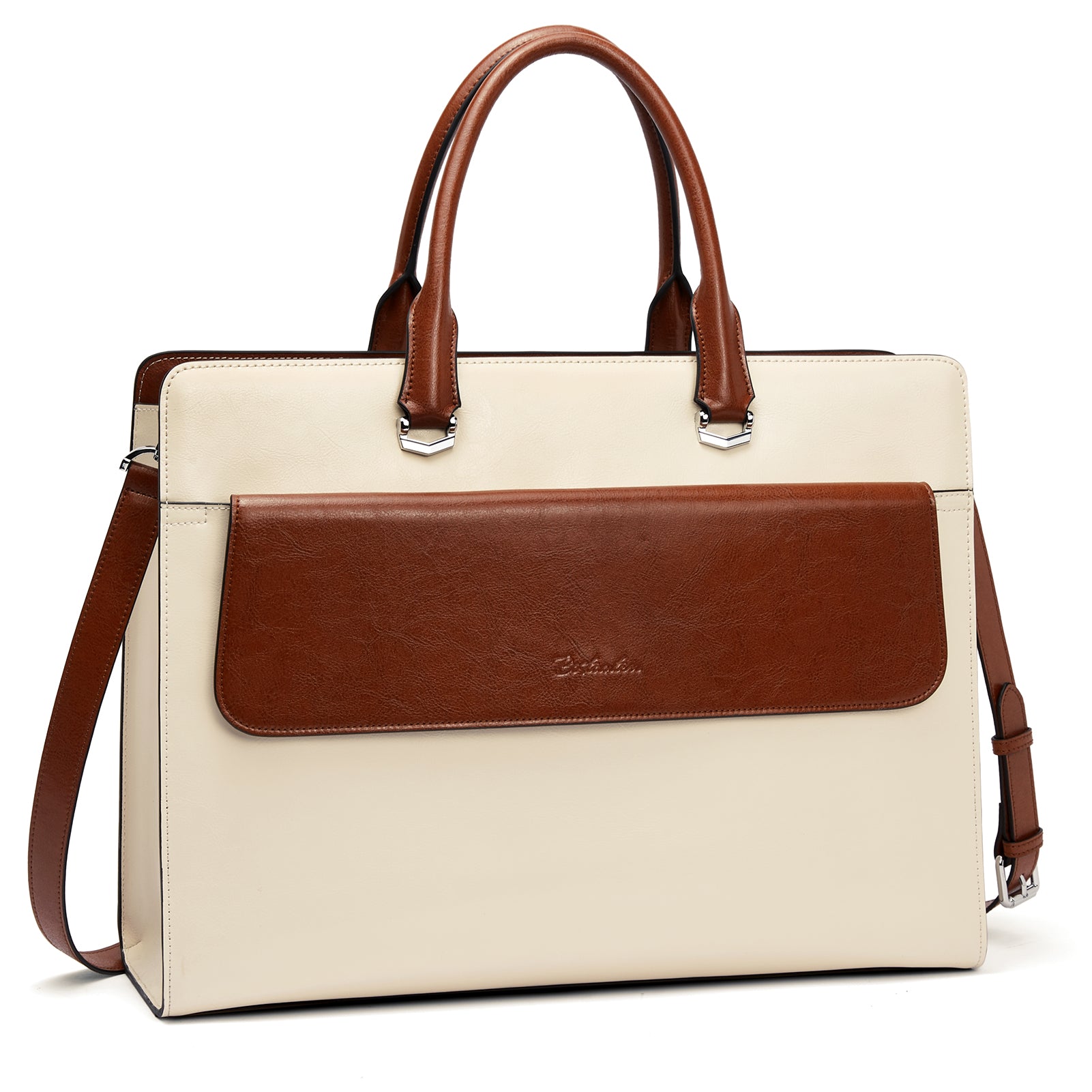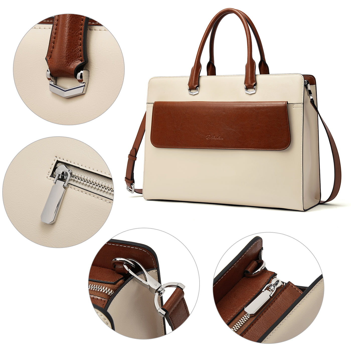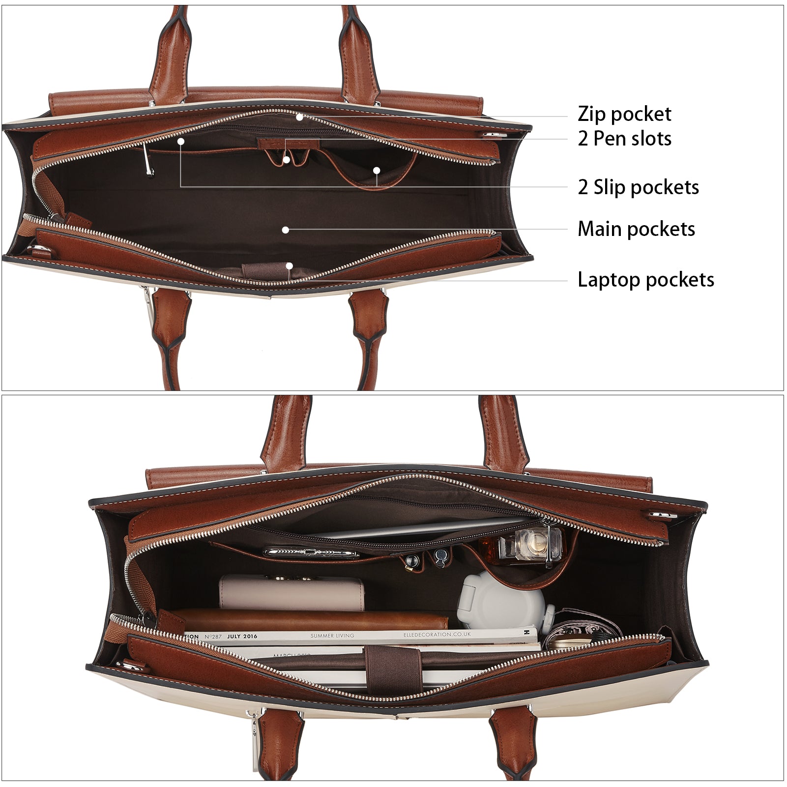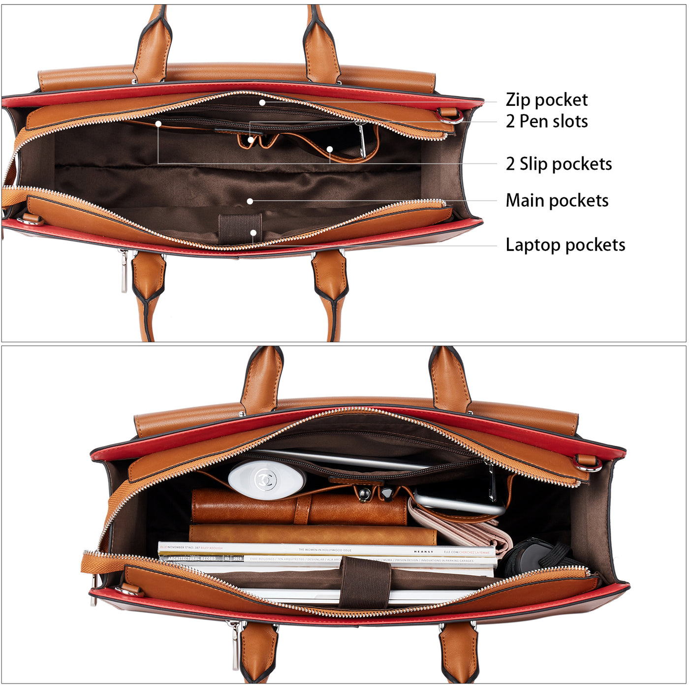 Functional Briefcase for Women -- Interior: 1 main zipper compartment including 1 padded laptop compartment for 15.6" laptop, 2 inner insert pockets, 2 pen slots and 1 inner zipper pocket. Exterior: 1 magnetic button front pocket, 1 back zipper pocket and metal feet. Large enough to organize your laptop, chargers, iPad, paper, folders, cosmetics, lipsticks, glasses, etc...