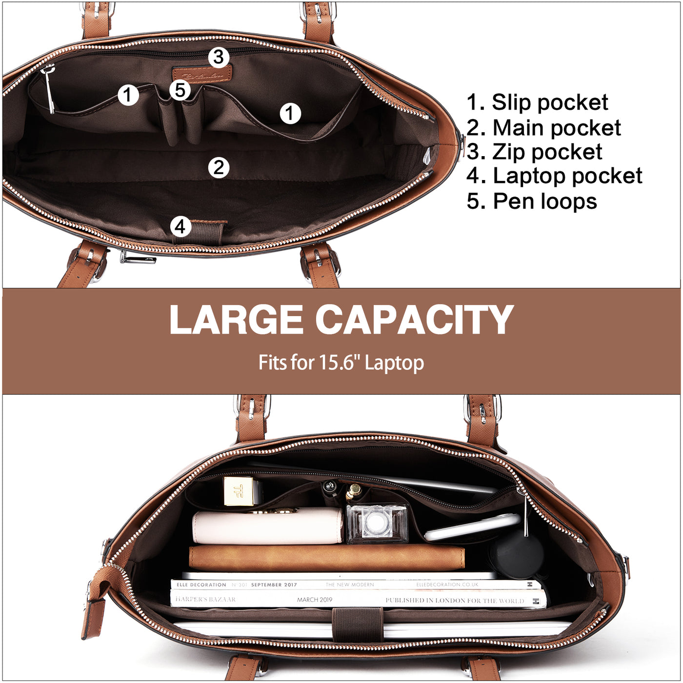 • Structure: The main compartments include 1 laptop padded compartment, 2 slip pockets, 2 pen loops, and 1 inner zipper pocket. The padded compartment is secure for protecting your 15.6-inch laptop. Dedicated pockets and slots for your wallet, pens, and smartphone. There is one front pocket for quick access and one back zipper pocket. Easily fit for your small things.