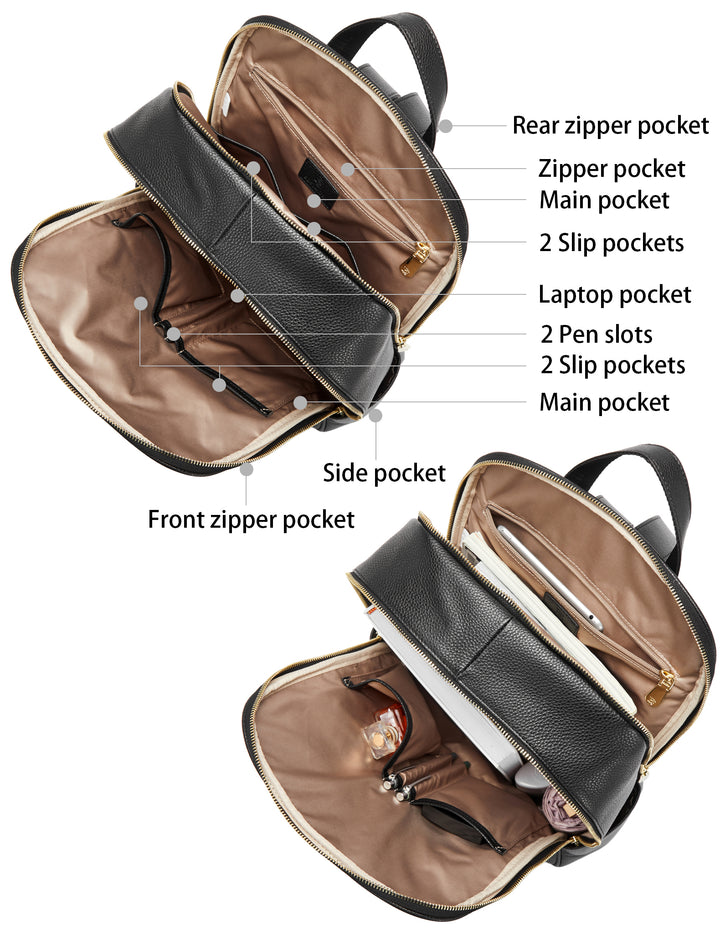 • Structure -- 2 main pocket,4 inner pocke,2 pen pocket,1 inner zipper pocket,1 laptop pocket,1 front zipper pocket,1 rear zipper pocket and 2 side pocket,so you can easy to access and store stuff.