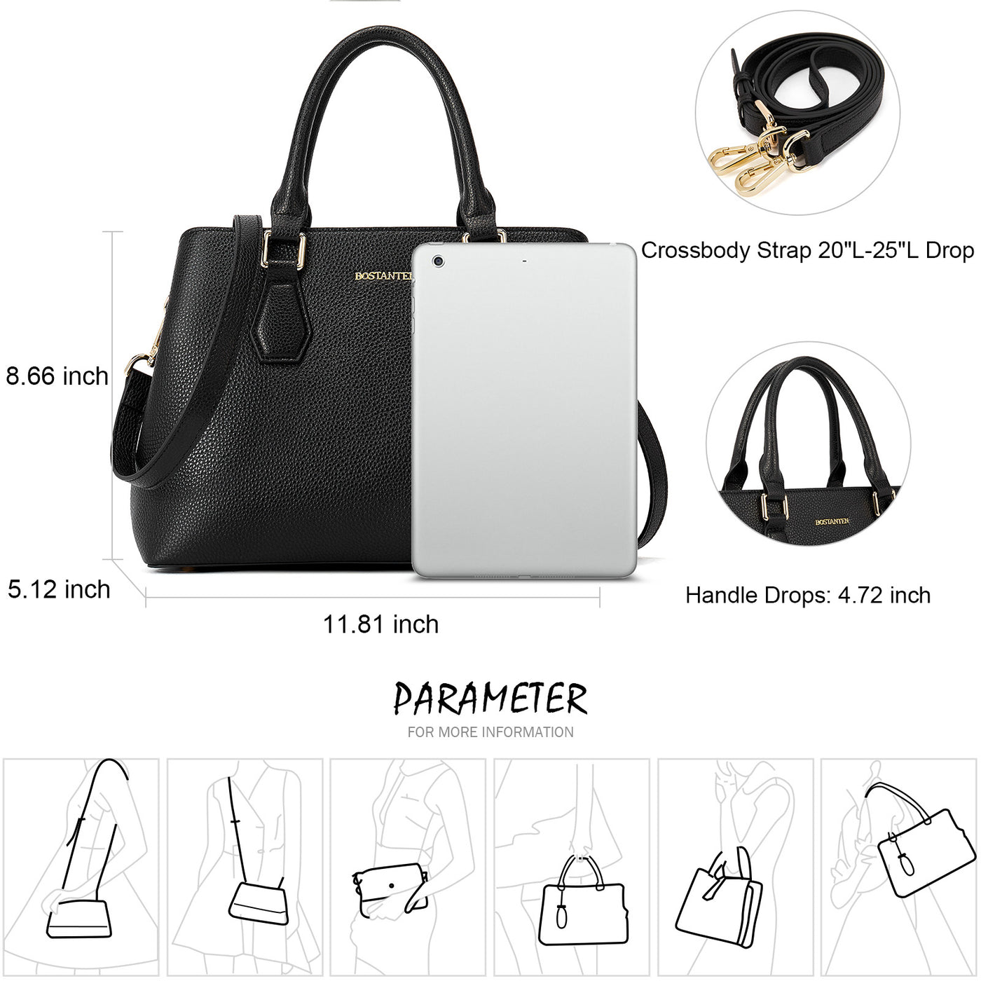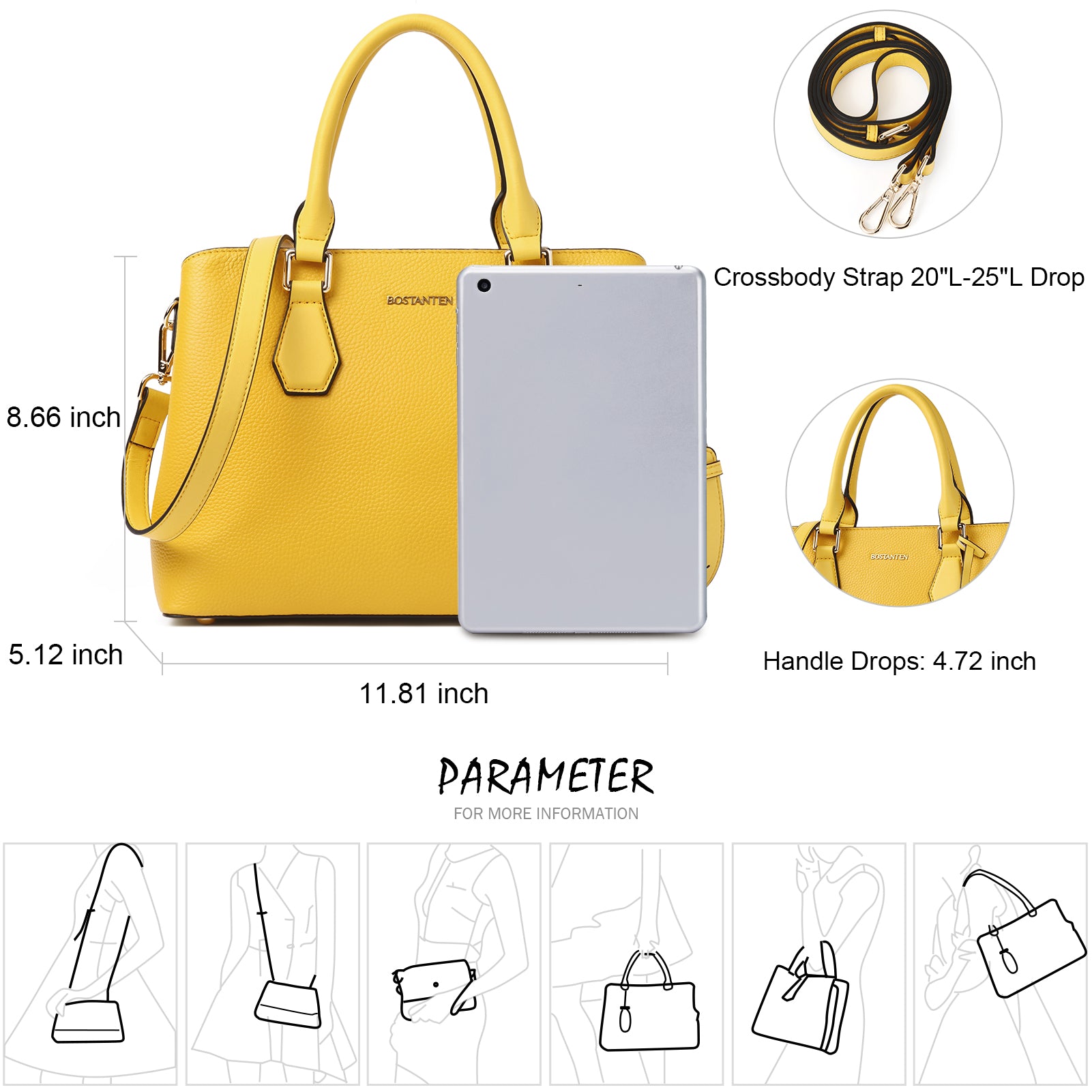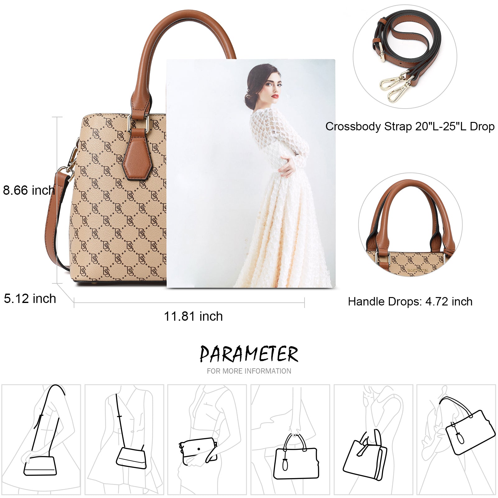 • Dimensions--Measured 11.81"(L) x 5.12"(W) x 8.66"(H), with approximately 4.72 inch handle drop, with a detachable and adjustable leather strap (Length drop 20-25 inch). Convenient & Comfortable to wear in 3 ways: Tote, Shoulder and Cross Body.