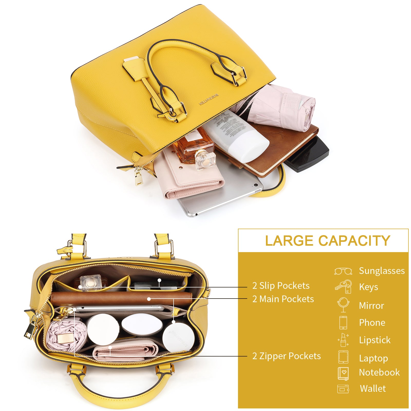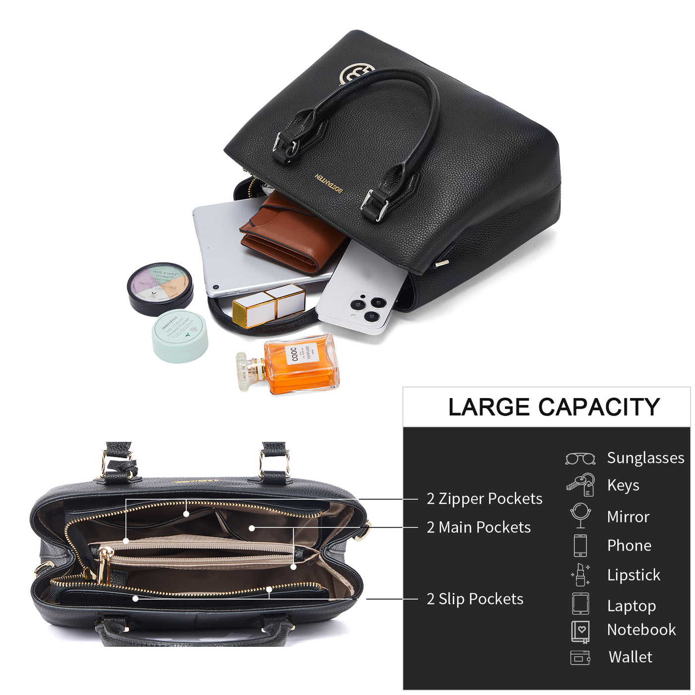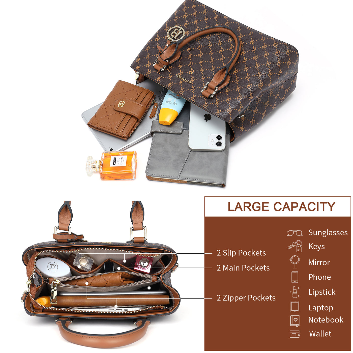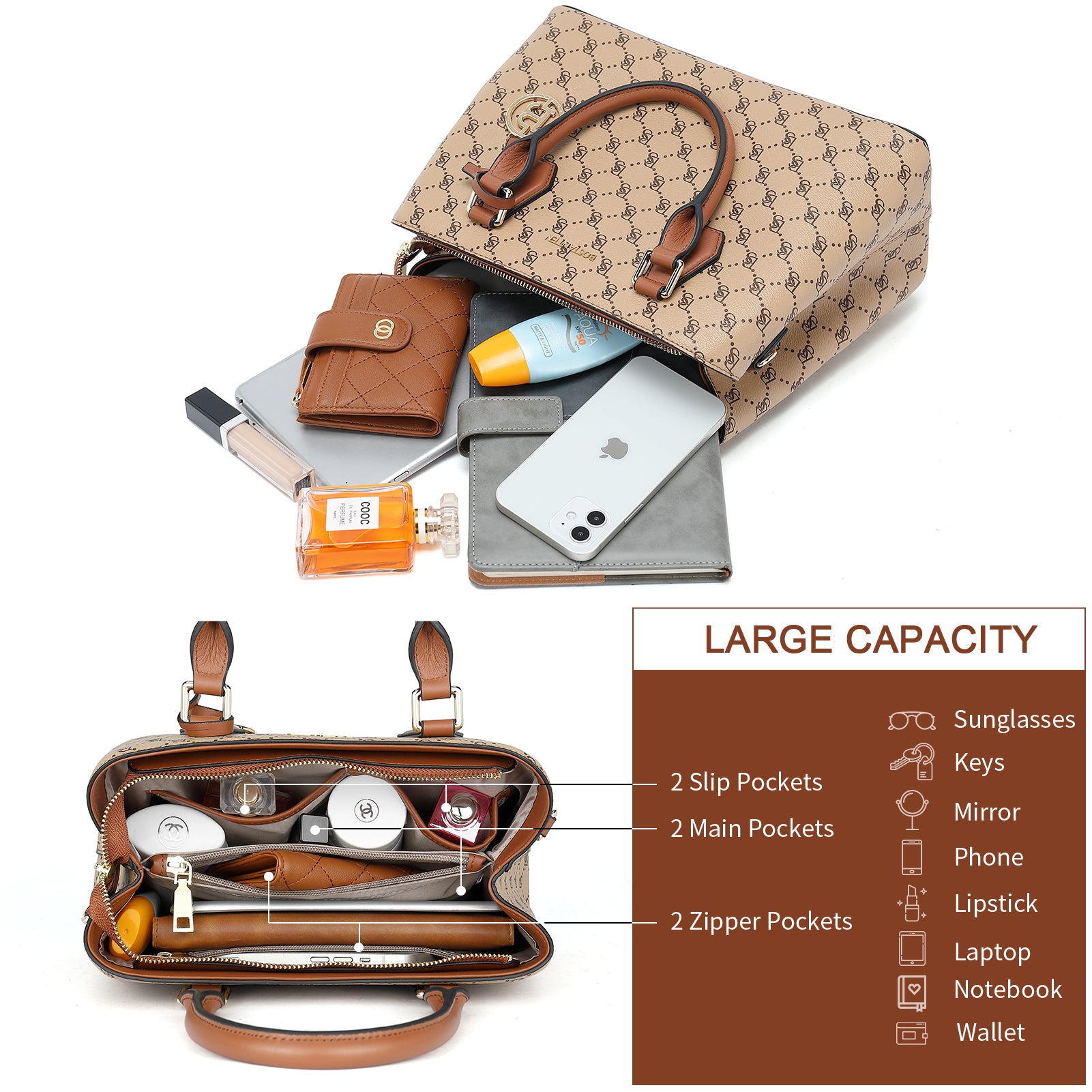 • Large Capacity--Interior structured with 2 main compartment, 2 inner zipper pocket, and 2 slip pockets. Inner space is large enough for hold IPAD, makeup bag, and wallet. A zipper compartment in the middle to divide storage area, not only easily taking small things such as cell phone, keys, money, card, checkbook or more, but it also make your items in tidy.