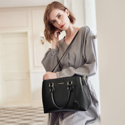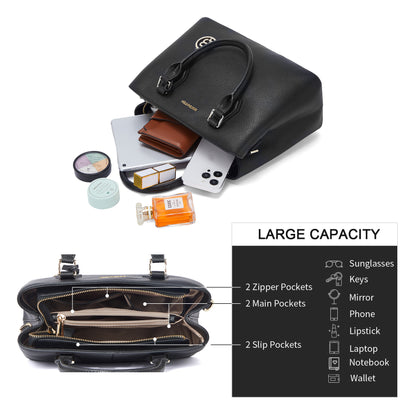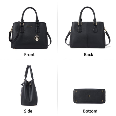 • Unique Design--Handcrafted by professional artisans, versatile black color and its well shape. A metal ornament covered with leather hanging on the bag as decoration. Top-handle design which its more elegant for formal occasion, adujustable shoulder strap can swtich to crossbody wearing fits for casual use. Simple and elegance!