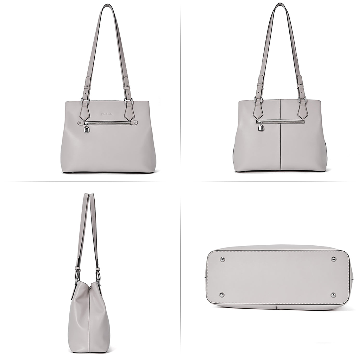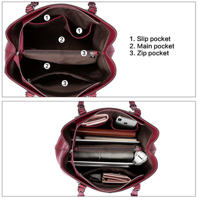 • Structure: Internal structure has two main compartments (divided by a central zip pocket), Besides, Including 1 zipper pocket + 2 open slip pockets. Exterior 1 back zip pocket and 1 front zipper pocket, Effectively keep your things well organized.