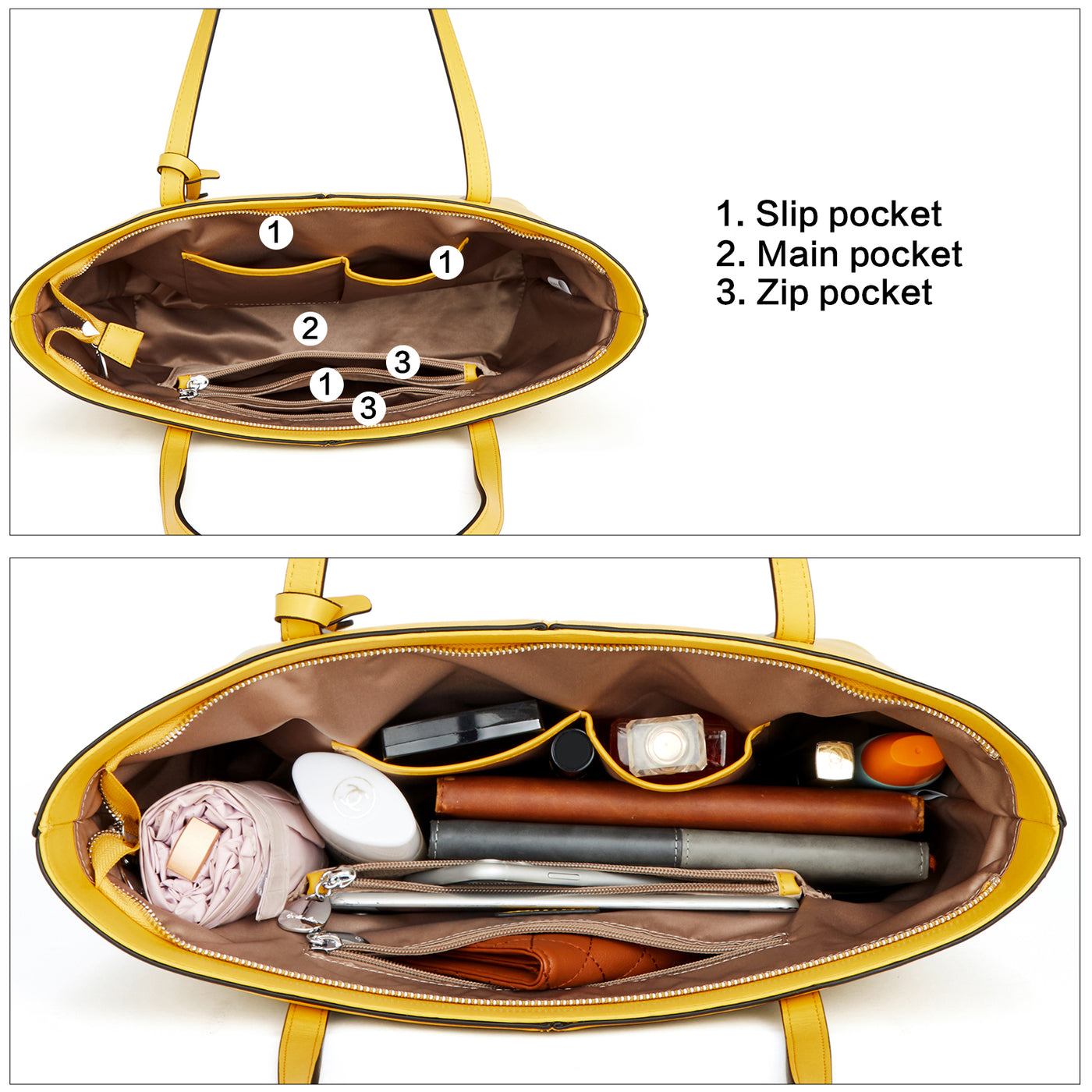 • Structure -- This leather handbag inner structure is a main zipper pocket. Including 1 zipper sandwich pocket + 2 slip pocket + 1 inner zipper pocket. Large capacity design, this tote purses can easily accommodate iPhone X, wallet, cosmetics, and other daily necessities. Perfect to use as daily handbags for working, shopping, or dating.