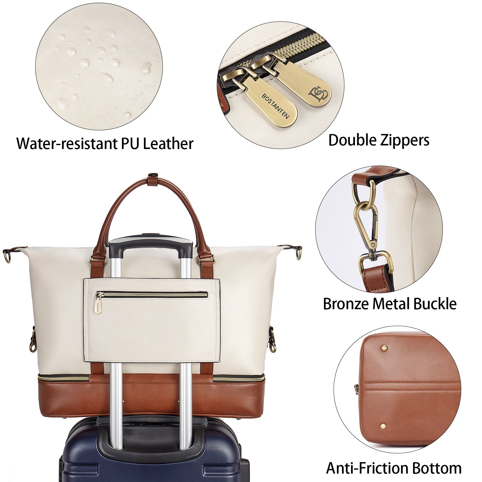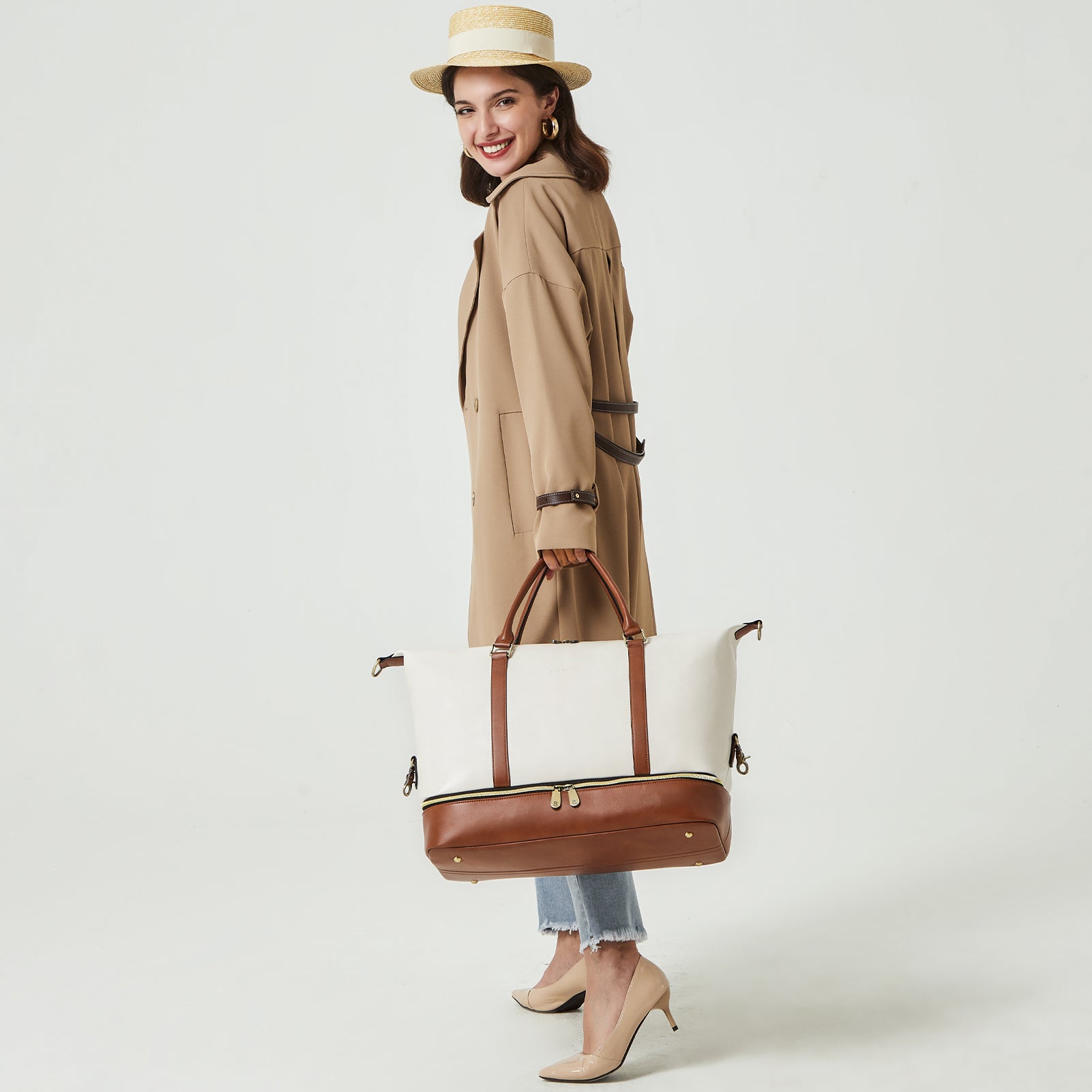• Premium Material -- This weekender bag for women is handmade by professional craftsman with high quality water-resistant PU leather, soft khaki fabric lining,and vintage bronze hardware.Well-knit stitch make it bear heavier weight stuff without tearing.Stylish but also durable as long as the time you use it.