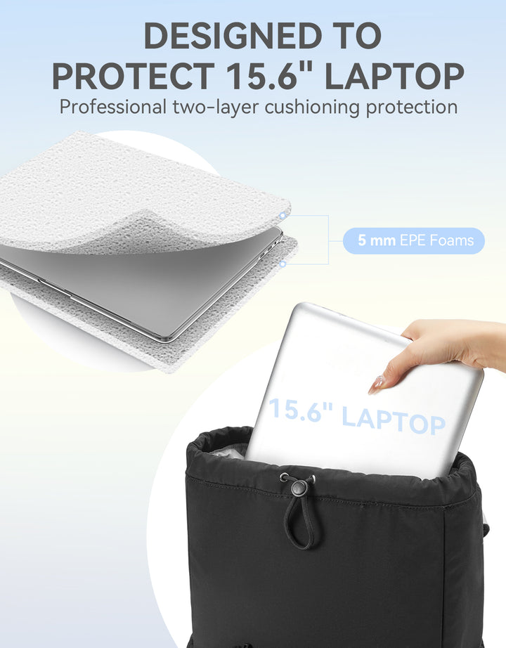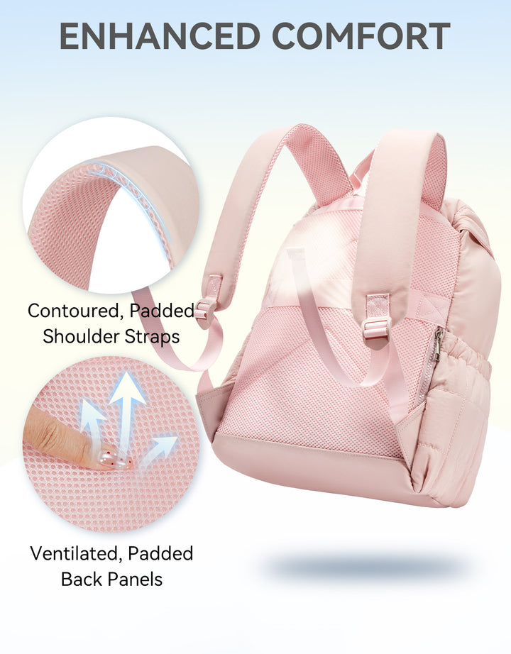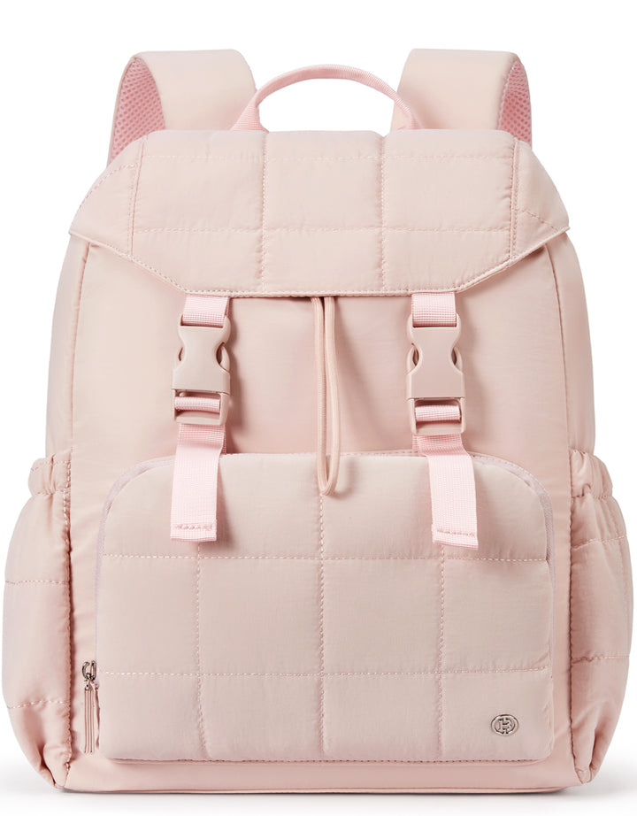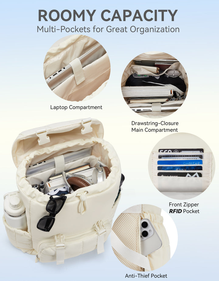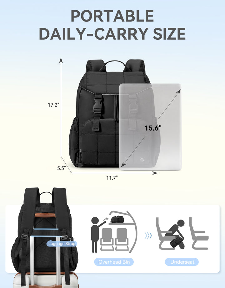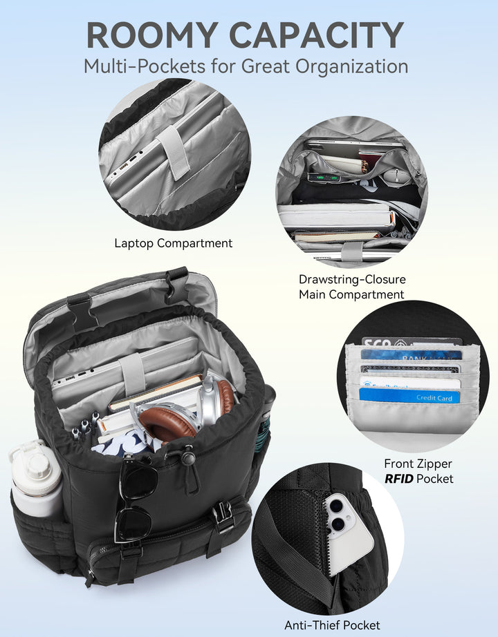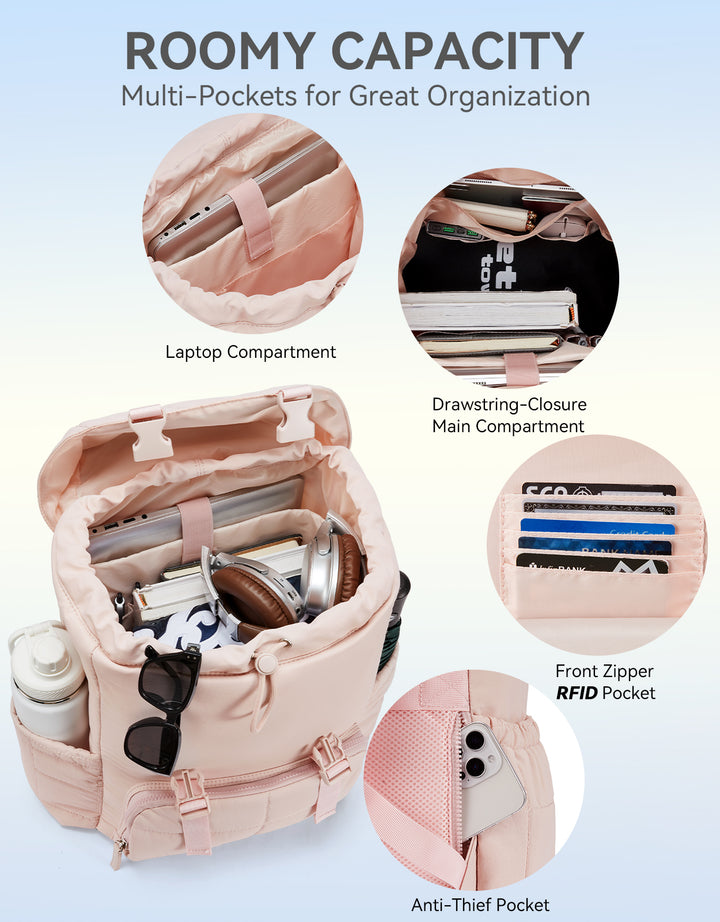 This stylish and functional women's backpack offers a roomy capacity with multiple compartments, including a padded laptop section for up to 15.6-inch devices, RFID-protected pocket, and anti-theft features. Designed for comfort with padded straps and a breathable back panel, it also boasts a user-friendly drawstring closure and trolley sleeve for travel convenience. Crafted from soft, lightweight, and water-resistant Taslan fabric with a quilted design, it’s perfect for daily use, commuting, or weekend trips.