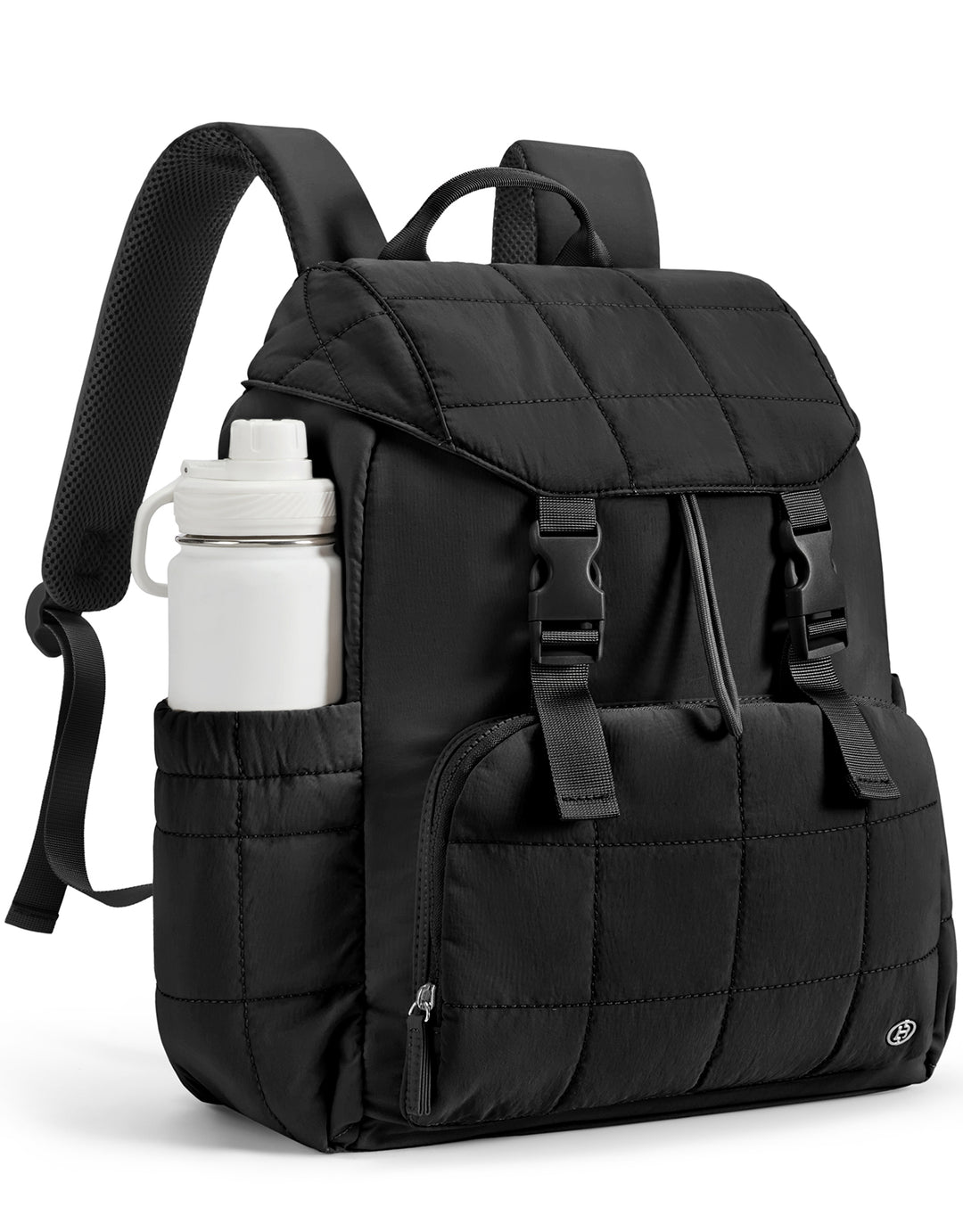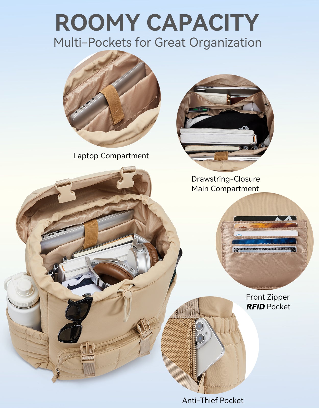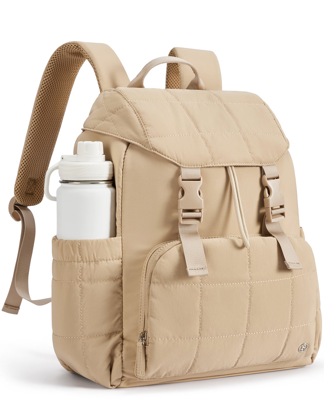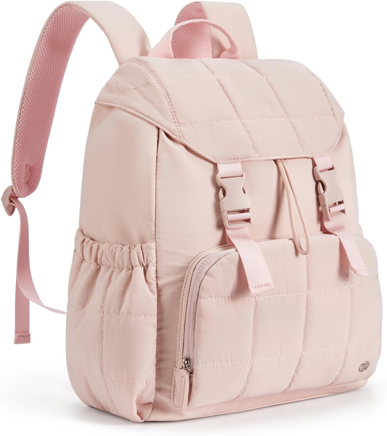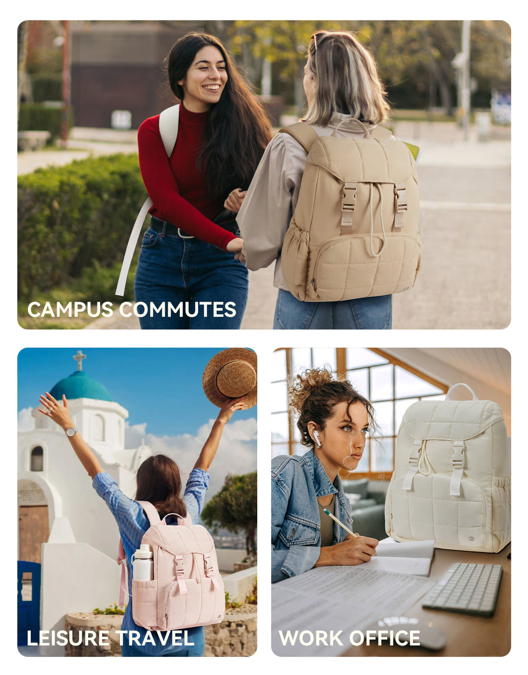 This stylish and functional women's backpack offers a roomy capacity with multiple compartments, including a padded laptop section for up to 15.6-inch devices, RFID-protected pocket, and anti-theft features. Designed for comfort with padded straps and a breathable back panel, it also boasts a user-friendly drawstring closure and trolley sleeve for travel convenience. Crafted from soft, lightweight, and water-resistant Taslan fabric with a quilted design, it’s perfect for daily use, commuting, or weekend trips.