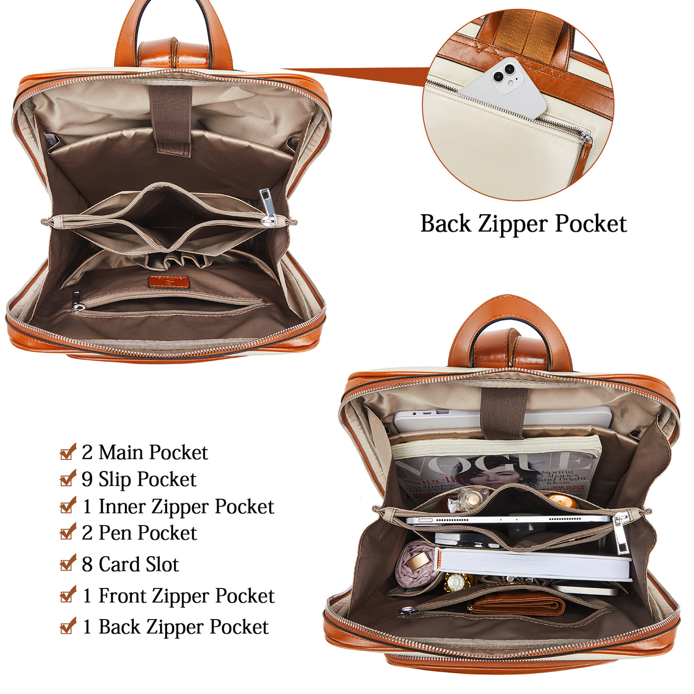 Multiple inner and front pockets ensure organization, while a back zipper pocket provides added security.