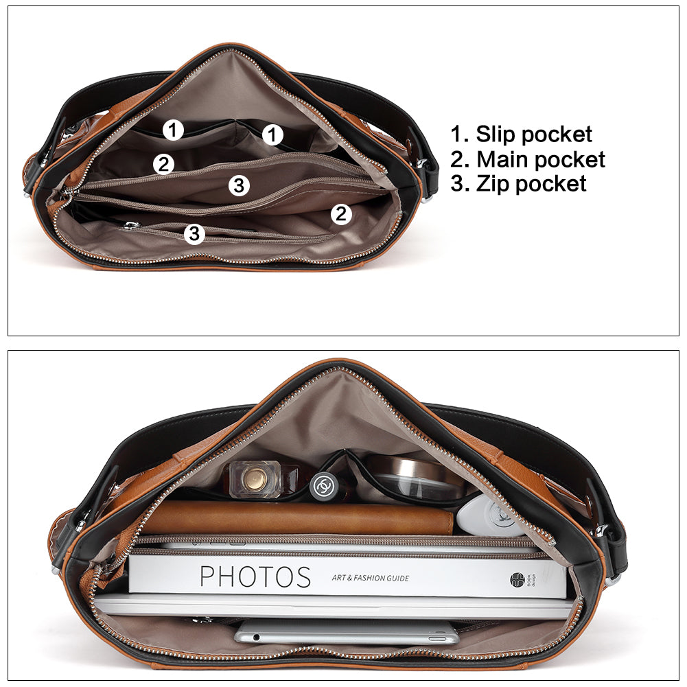Design -- The hobo handbag adopts contrast color design. simple, bucket style, suitable for work, daily and other occasions. Large capacity designed allow you can comfortably hold an iPad, iPhone6s Plus, wallet, cosmetic, and other daily things, perfect to use for working, shopping, or dating.