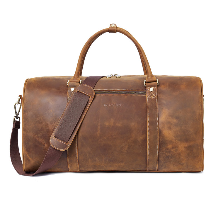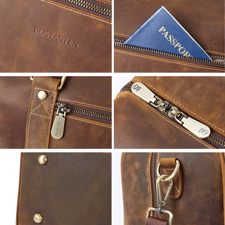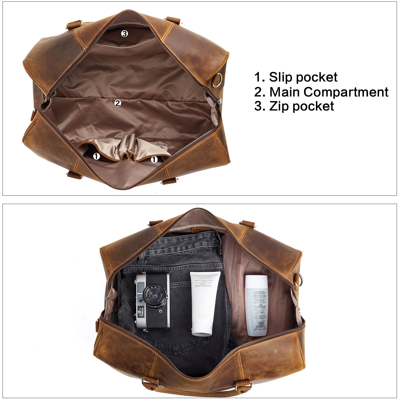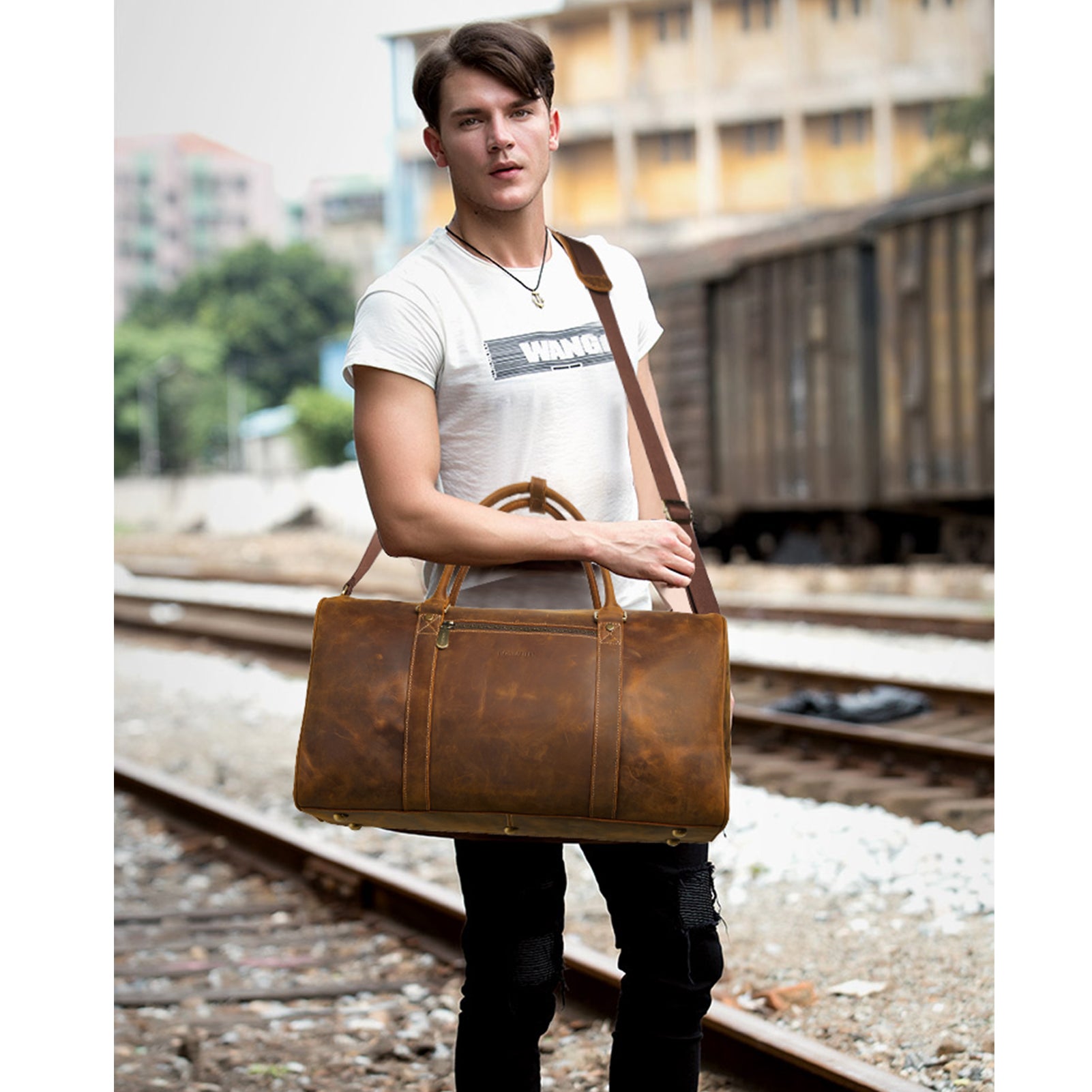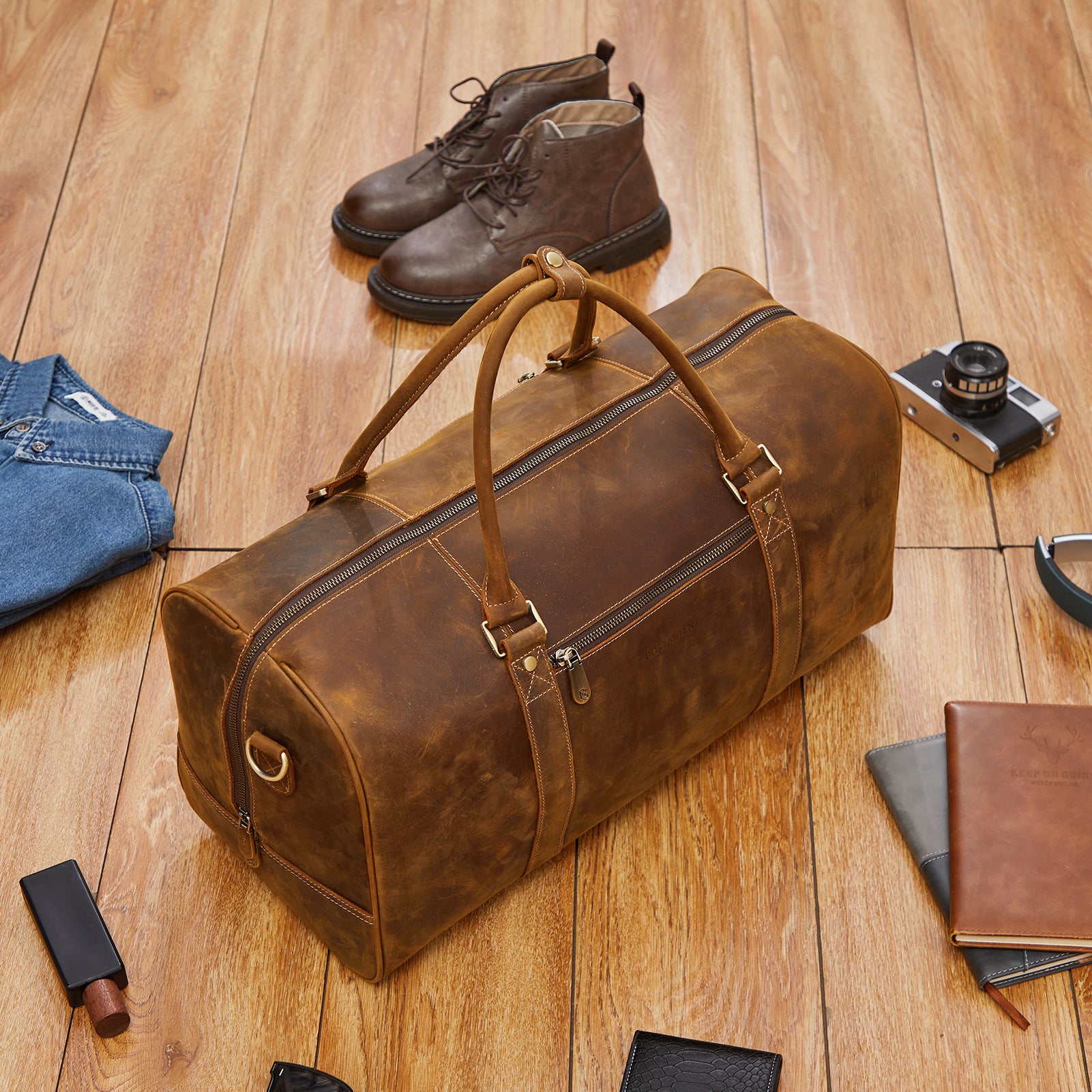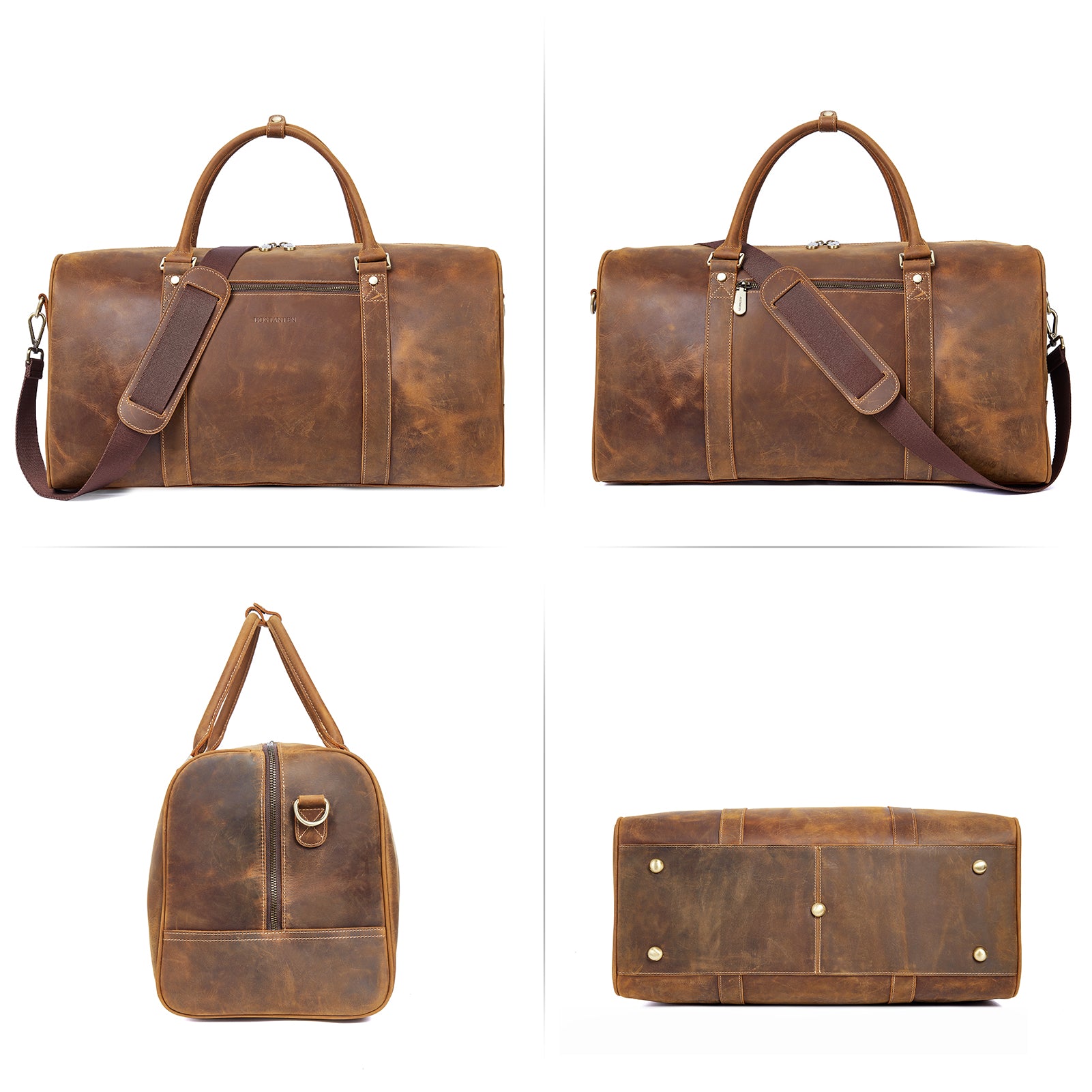 • Top Quality Material -- Handmade by professional craftsman with full grain crazy-horse top layer genuine leather which is imported from Italy, perfect for traditional leather lovers.This artisan technique maintains a natural look of leather, leaving each piece with a slightly different pattern,making your bag unique in the world.Soft khaki fabric lining,vintage bronze hardware make this duffle bag luxury and elegant.