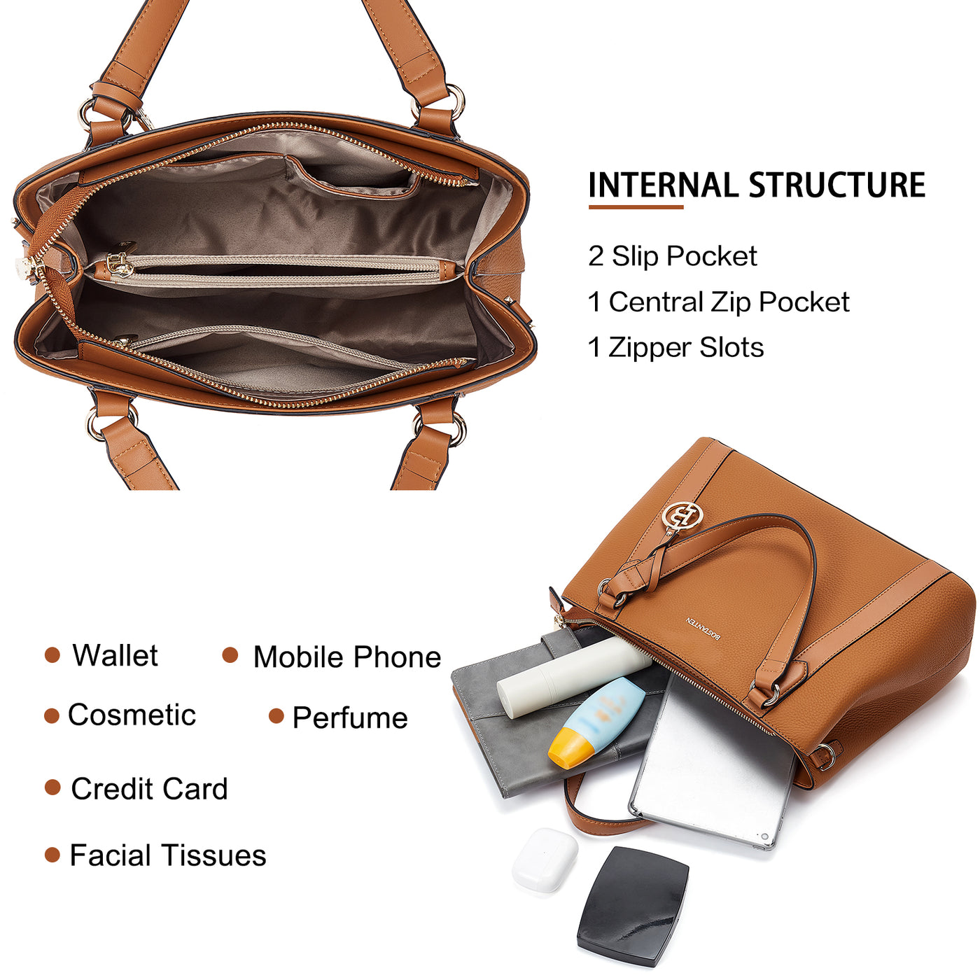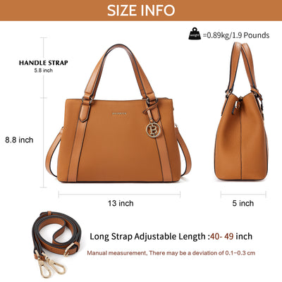 • Dimension : Available handbag size is 13.0(L) * 5(W) * 8.8(H) inch. Dual top handle strap height is 5.8 inch. Providing one extra crossbody strap could meet more carrying style. Enough length from 40 to 49 inch as a shoudler, crossbody, top handle, etc. Good handbag choice to fit your various outfit idea.