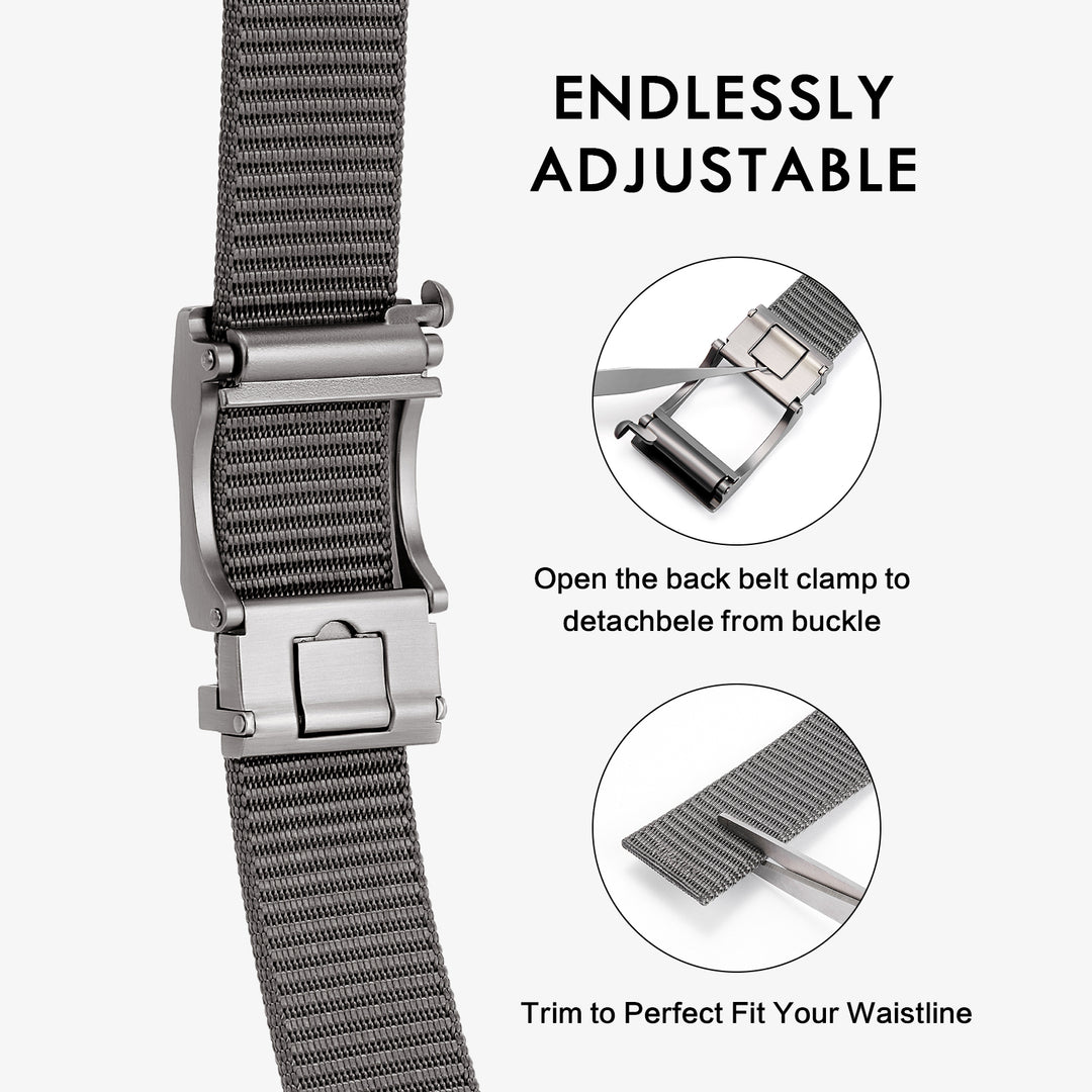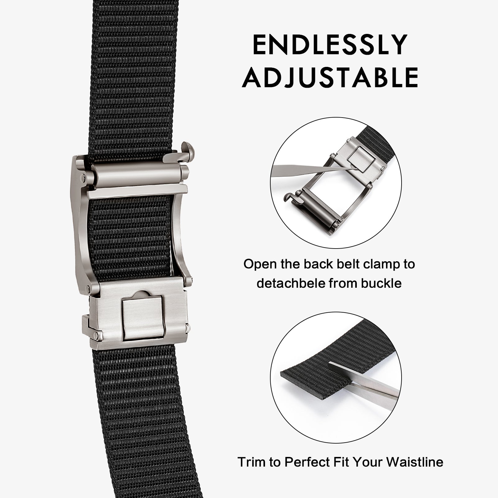 Perfect Fit: The ratchet belts are adjustable in 1/4 inch increments vs the 1 inch increments in traditional belts. You can adjust the belt anytime to fit your waist. Removable buckle that allows you to cut the belt to your ideal size.Size: 3.5cm width, 130cm length.