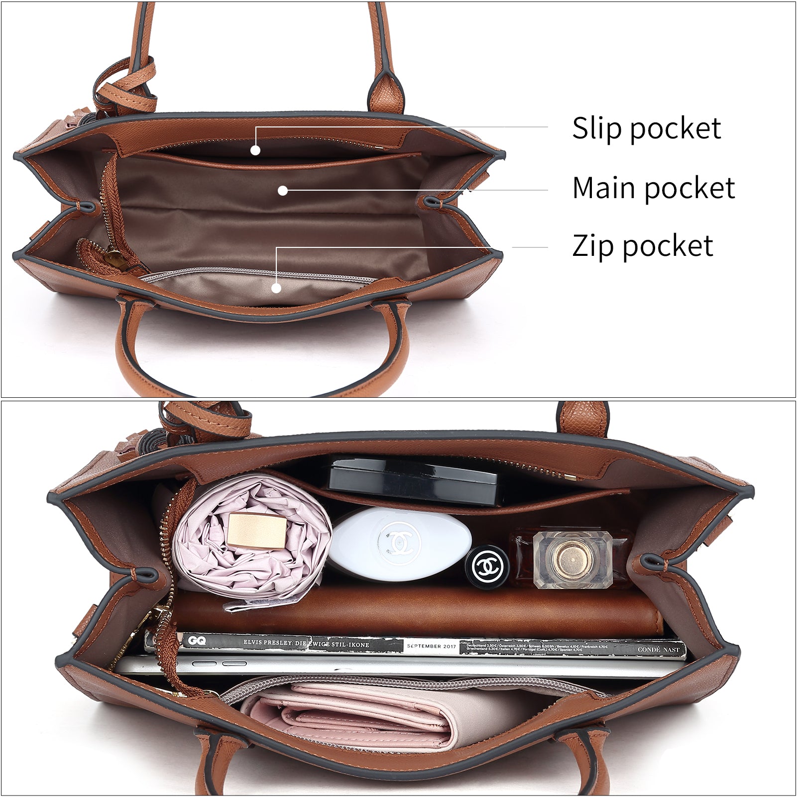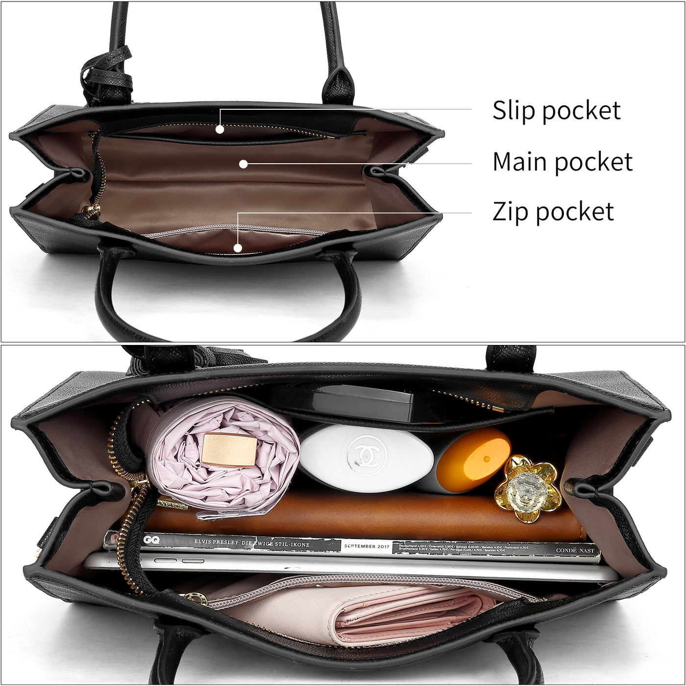 • [ Pocket Structure ]: Featuring a main space with 1 zipper pocket and 1 slip pockets. The top-zipper closure design could provide a secure access as well as slim the handbags upper width. Main compartment could effectively carry you daily necessities perfectly just easy. (phone, keys, sunglasses,small wallet etc).