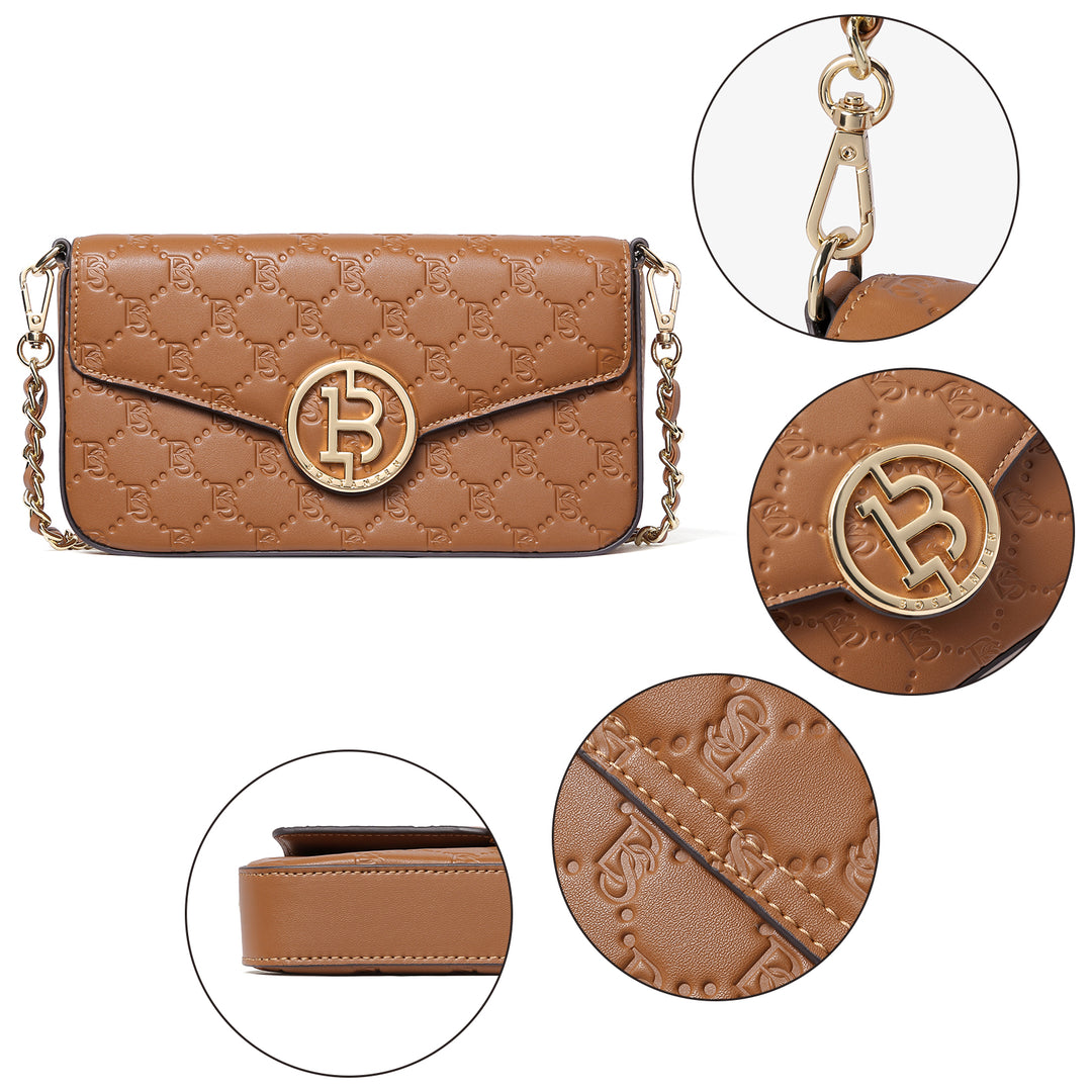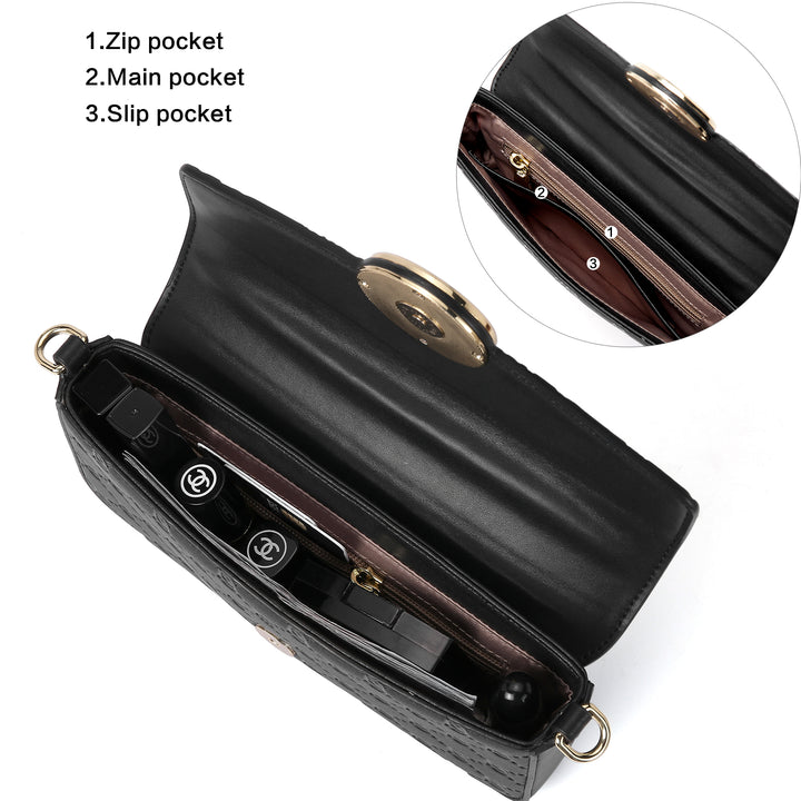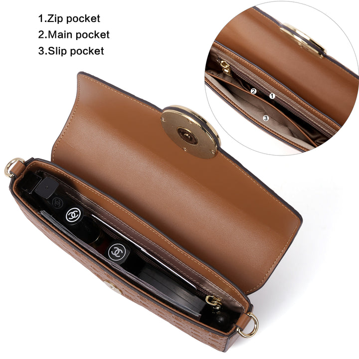 Material: Quilted from our signature-print appeal with front gold-colored mental logo detail,made from high quality cowhide leather, the trendy crossbody bag is design in a sleek, elegant silhouette. fastens with a magnetic snap button flap closure.