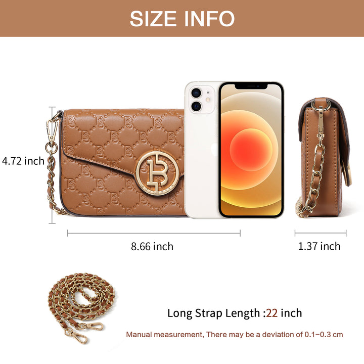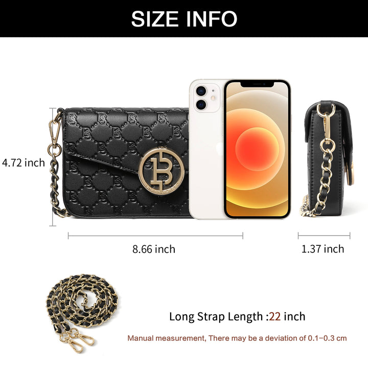 Dimensions: (L)8.66" x (W)1.37" x (H)4.72", weight 0.94 Lbs, with a 22" long detachable shoulder chain straps, convenient & comfortable to wear in 2 ways: Shoulder and Crossbody