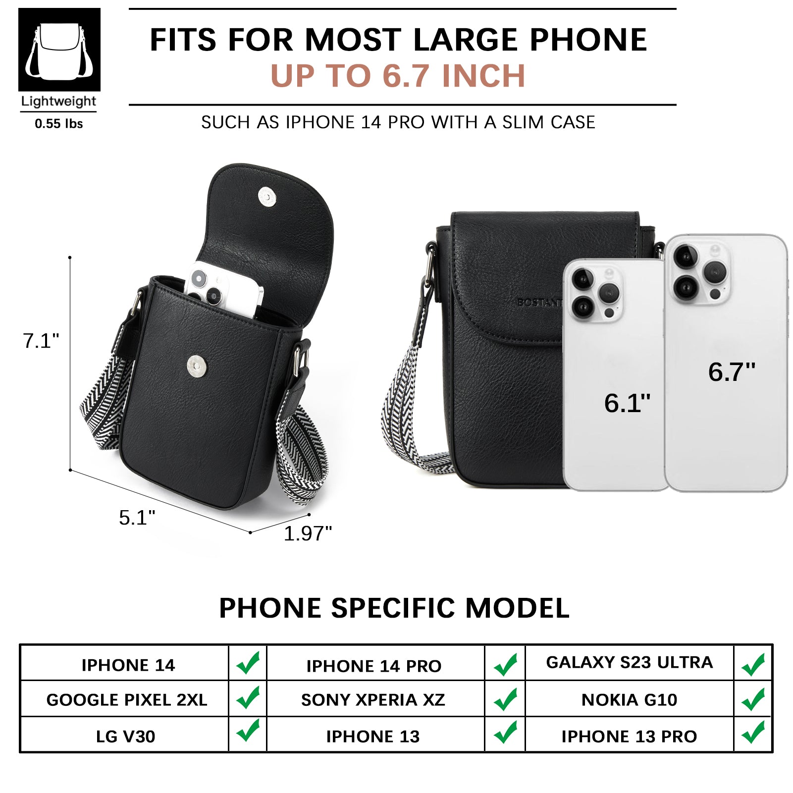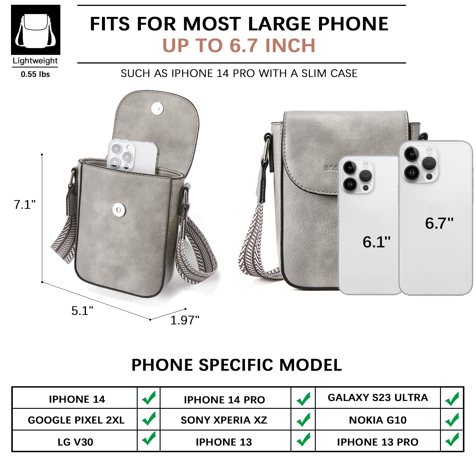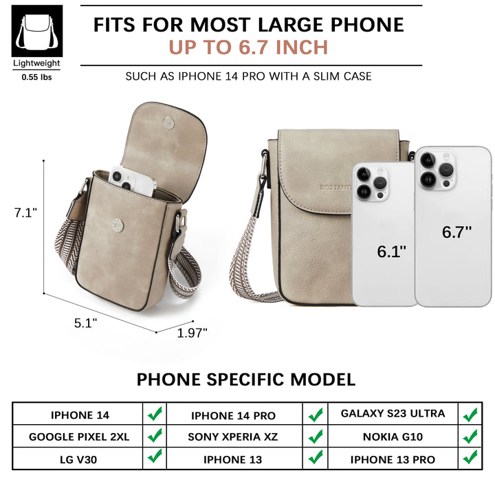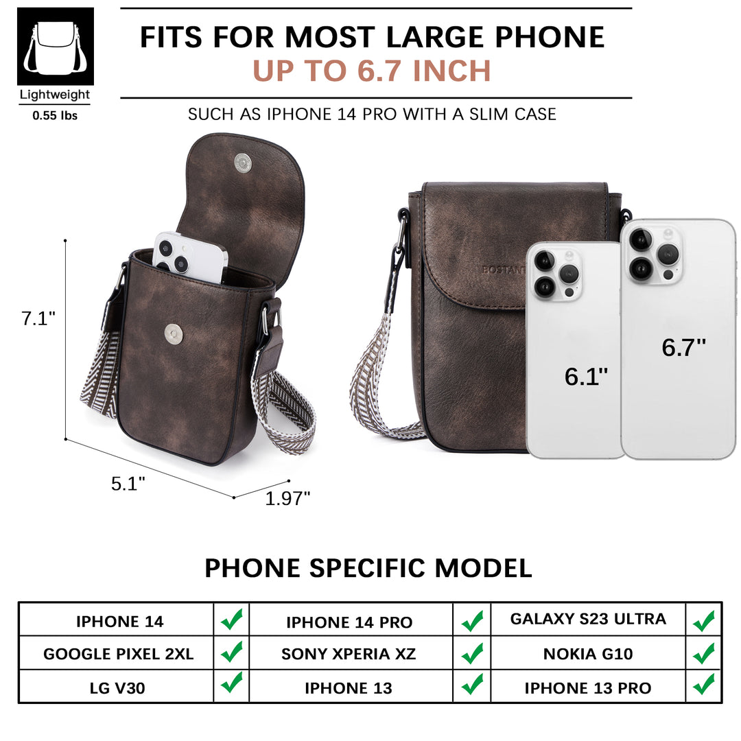 The Phone Crossbody Bag features a stylish design with a magnetic front flap and a smooth interior to protect your items. It offers a main compartment with one zip pocket and one slip slot, making it easy to organize essentials like a 6.7” phone, lipsticks, and cards. Compatible with most large phones, including the iPhone 14 Pro and Galaxy S23+, it’s a fashionable and practical choice, perfect as a gift for any occasion.