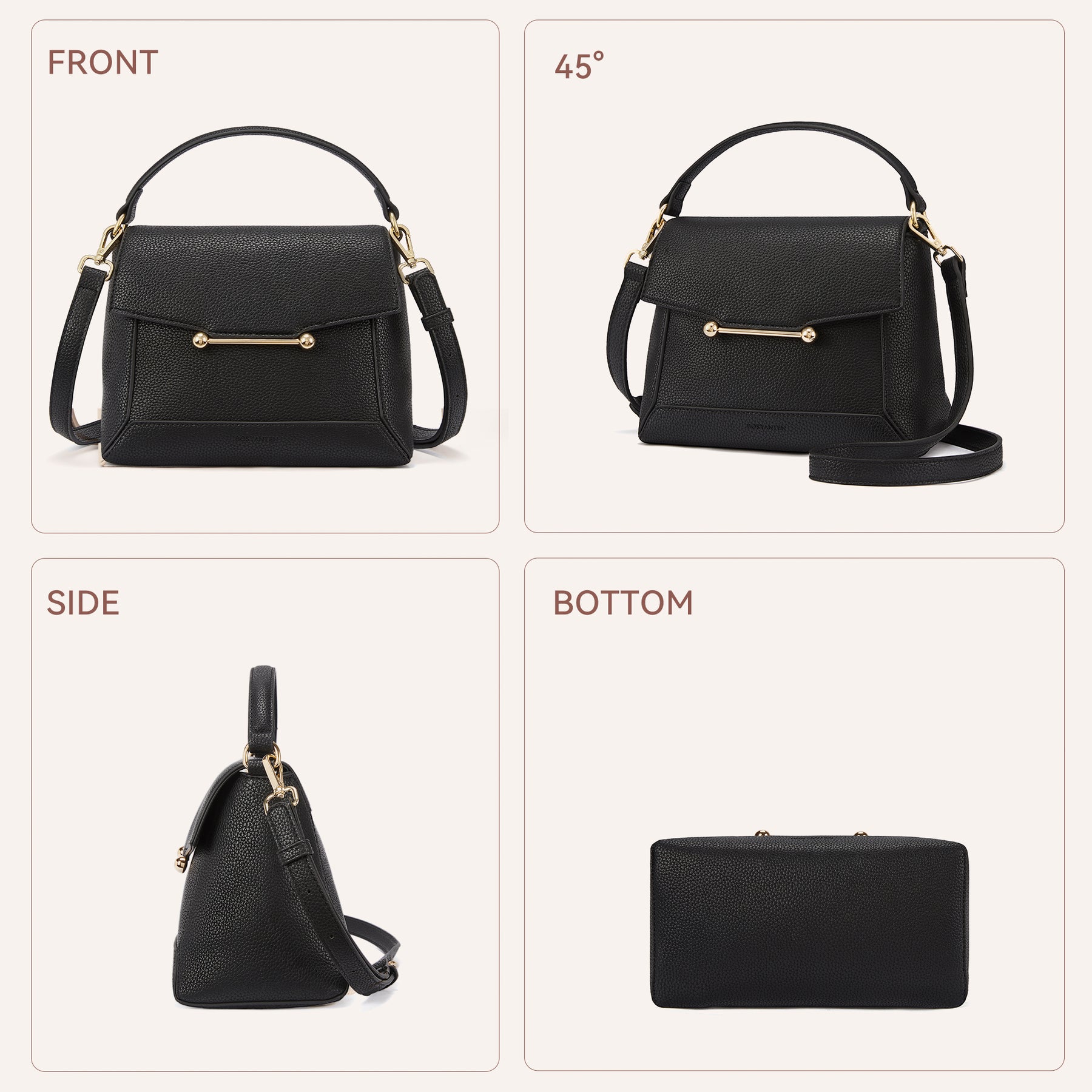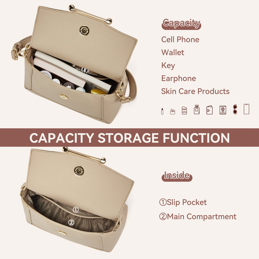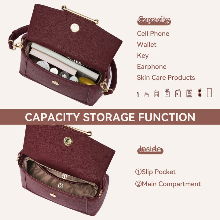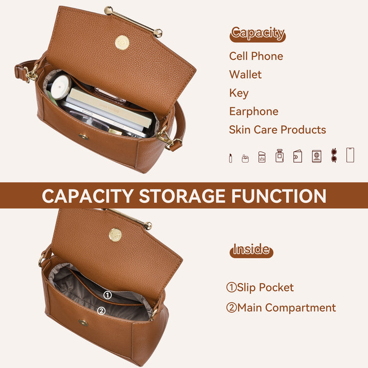 This small crossbody bag features a secure magnetic flap closure to keep your essentials safe and accessible. Crafted from high-quality vegan leather with elegant metal accents, it retains its shape while offering a refined look. The compact size includes a main compartment with an inner pocket—perfect for phone, wallet, and daily items. With a top handle and adjustable strap, it can be worn as a crossbody, shoulder bag, or handbag. A stylish and thoughtful gift for any occasion.