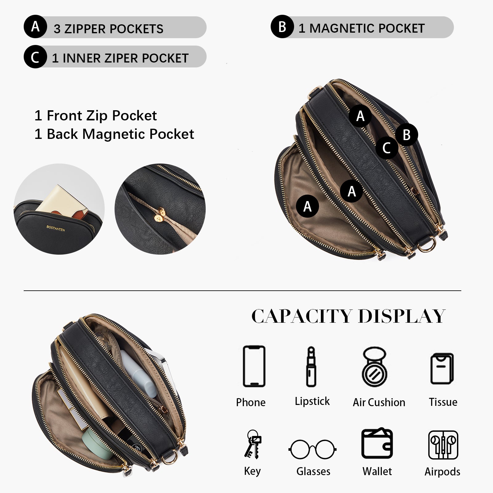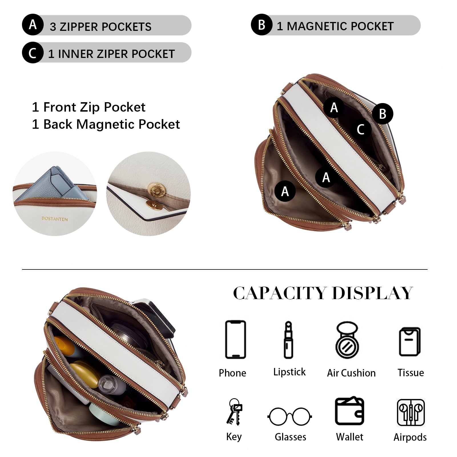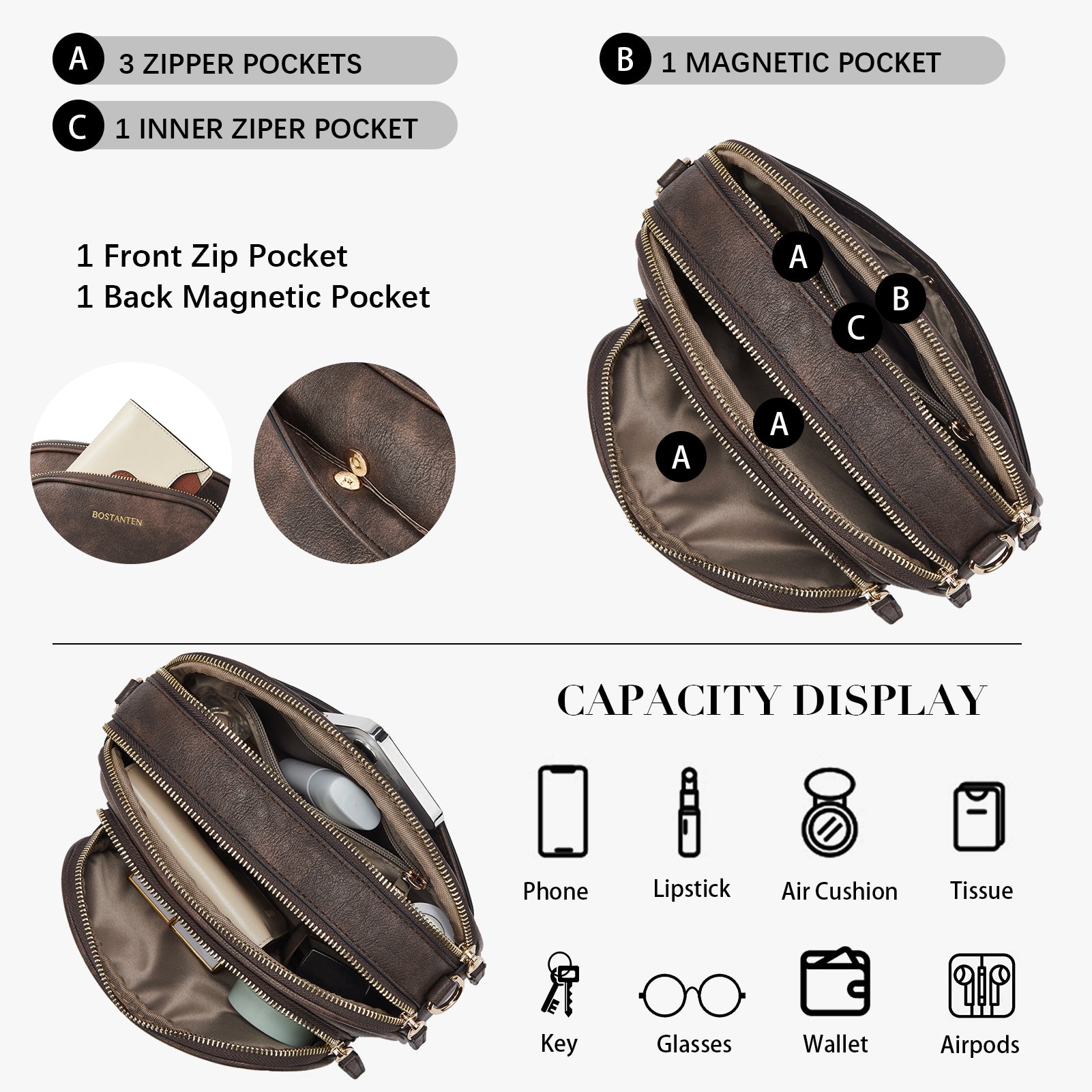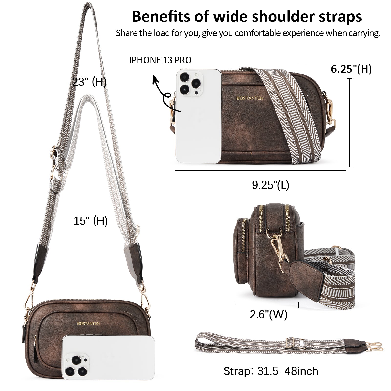Multi Pockets: The crossbody bag with 4 zipper pockets + 1 inner zipper pocket. (Include: Front 1 zip pocket + Back 1 zip pocket). Whether on the front or the back, there are dedicated cell phone pockets for easy access. And there is zipper protection, not afraid of falling and theft.