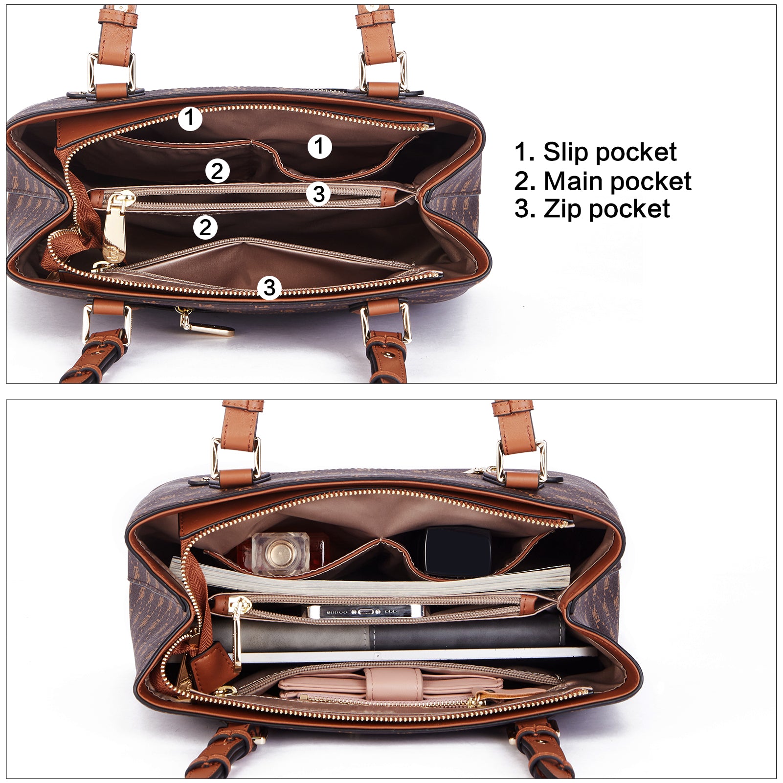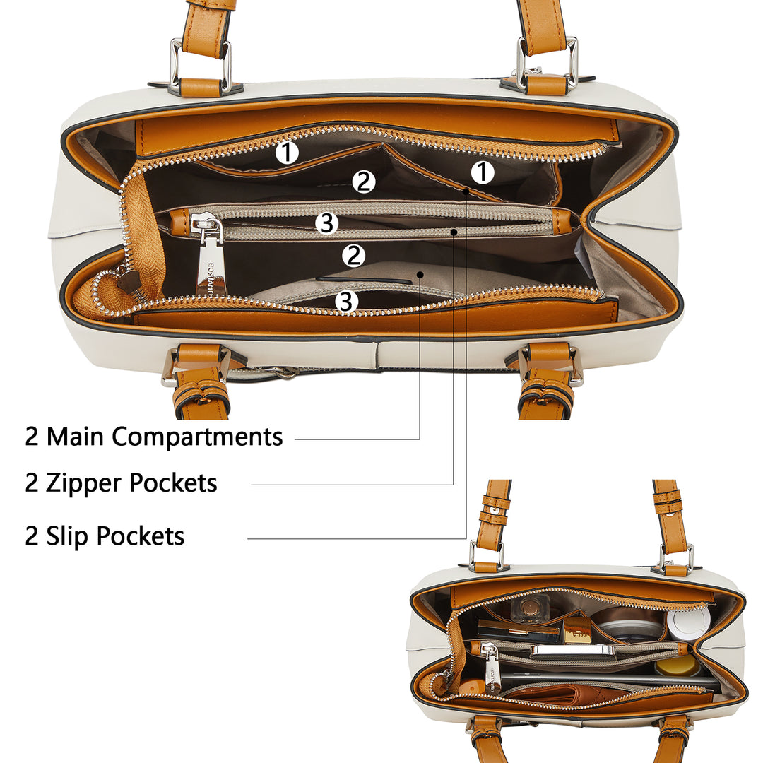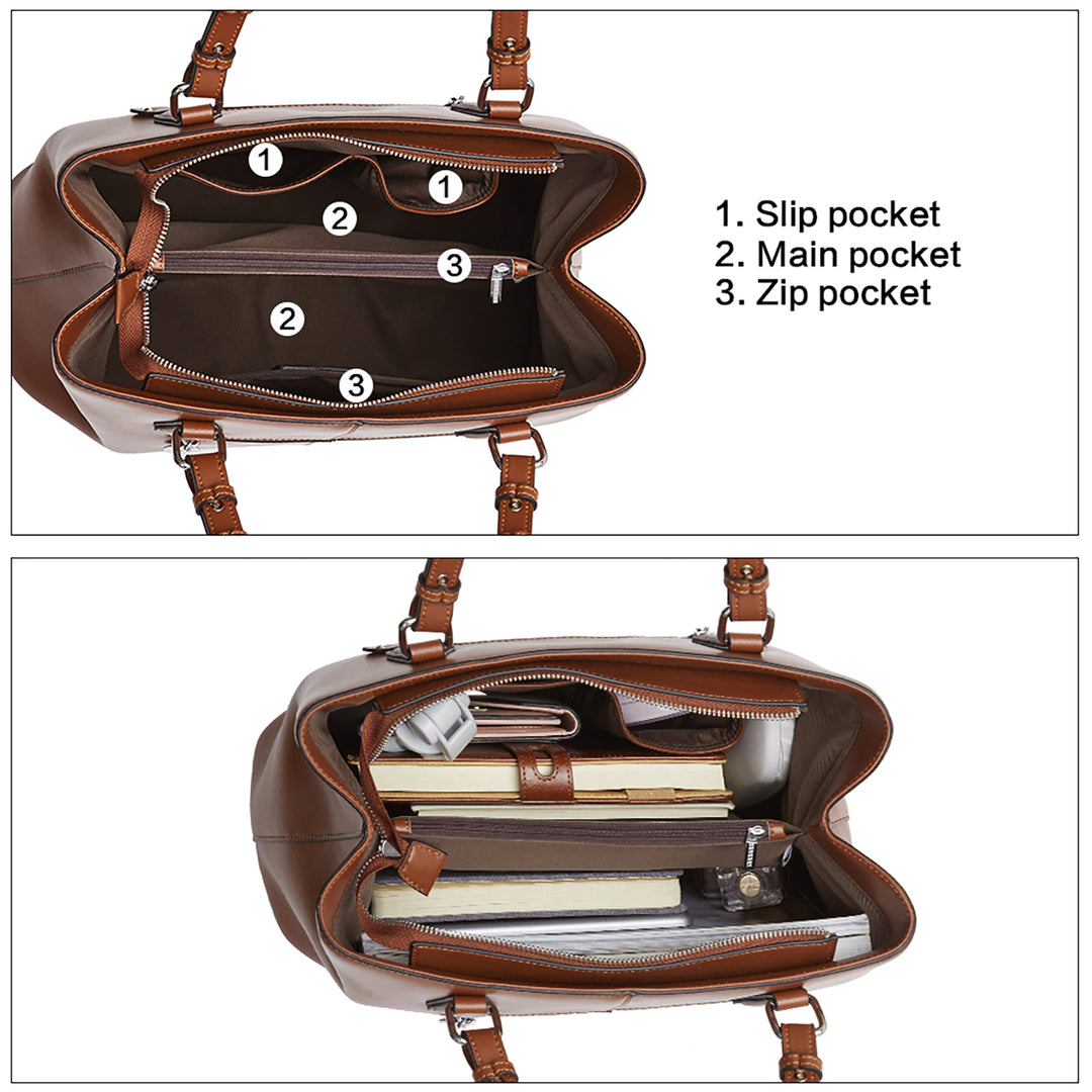• Structure: Internal structure has two main compartments (divided by a central zip pocket), Besides, Including 1 zipper pocket + 2 open slip pockets. Exterior 1 back zip pocket and 1 front zipper pocket, Effectively keep your things well organized.