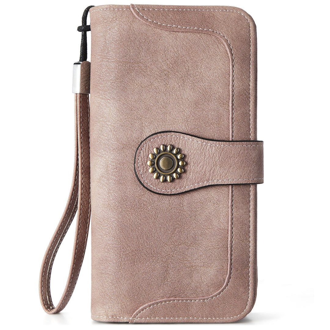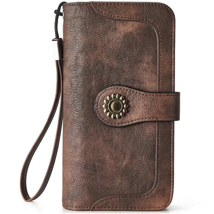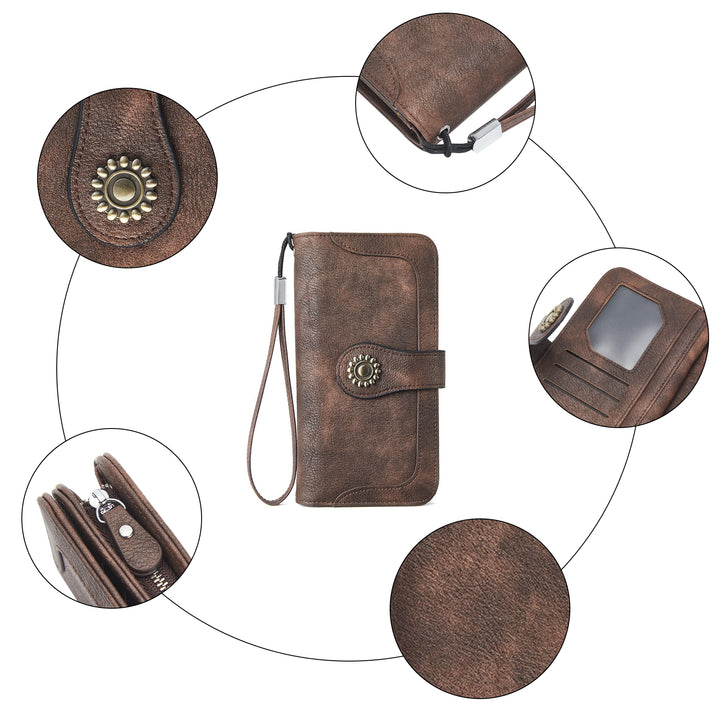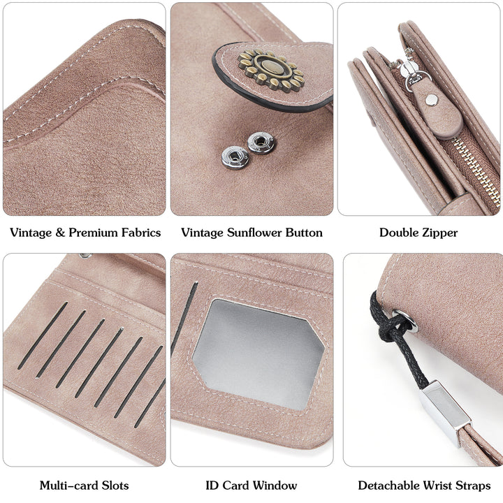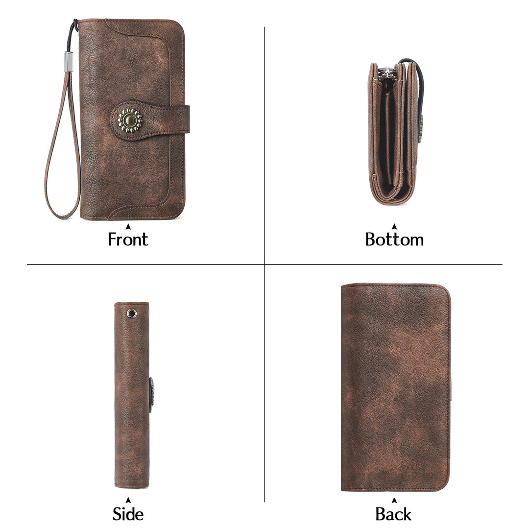 Unique Features -- Made of high quality leather. Durable zipper and snap for long time use. Each wallets for women comes with a wrist strap, biofold wallet is convenient to use. Sun flower buckle and hollow design are in vintage style and more fashion.