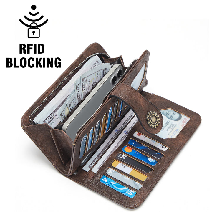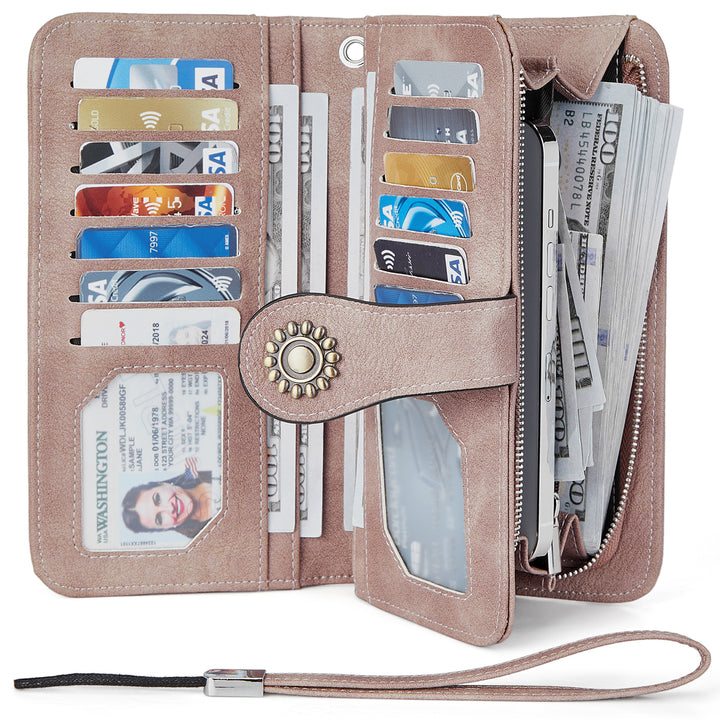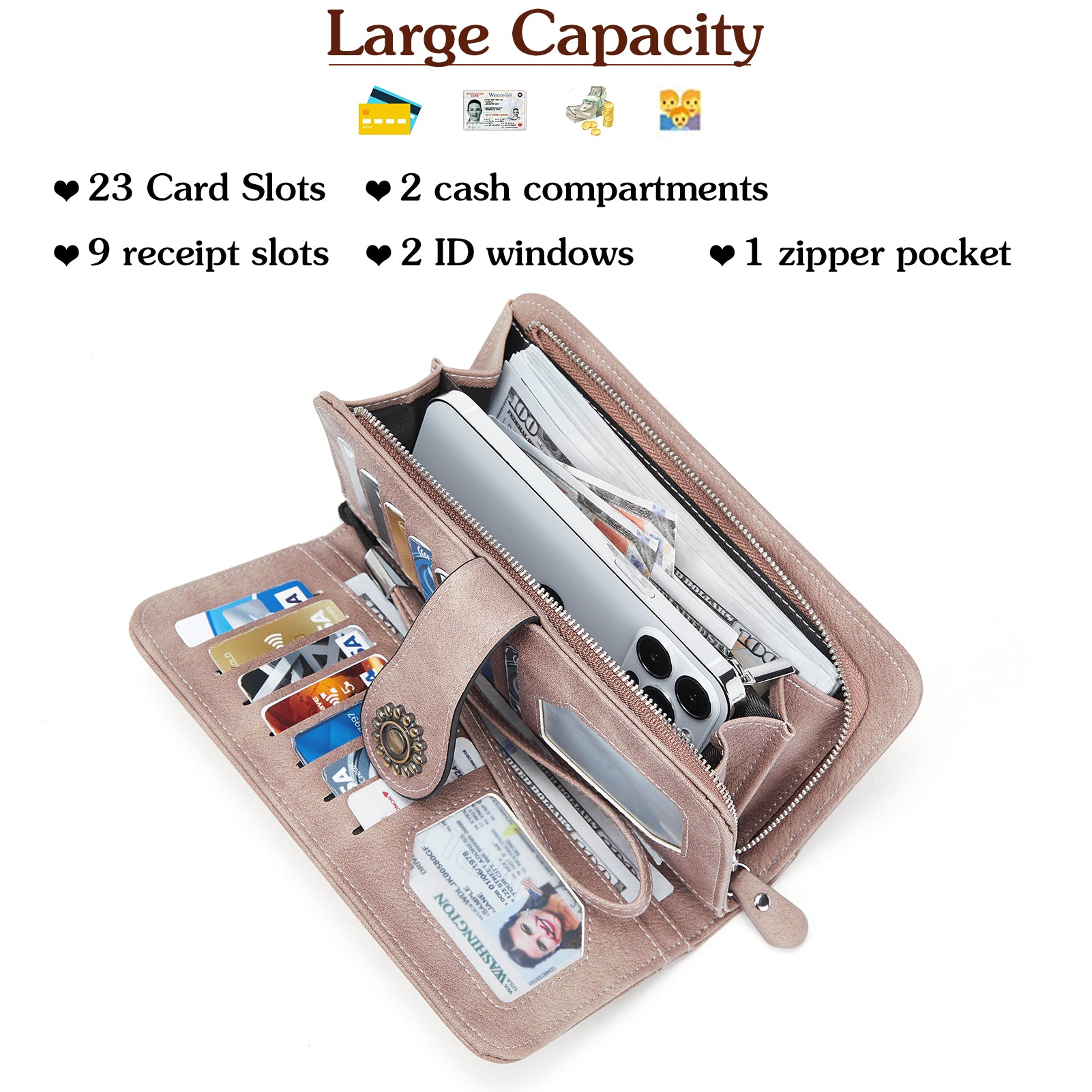 Large Capacity -- This leather wristlet wallet contains 13 card slots, 1 ID windows, 4 receipt slots and 1 zipper pocket. Roomy enough for carry phone, cash, credit cards, ID cards, receipts, and coins.