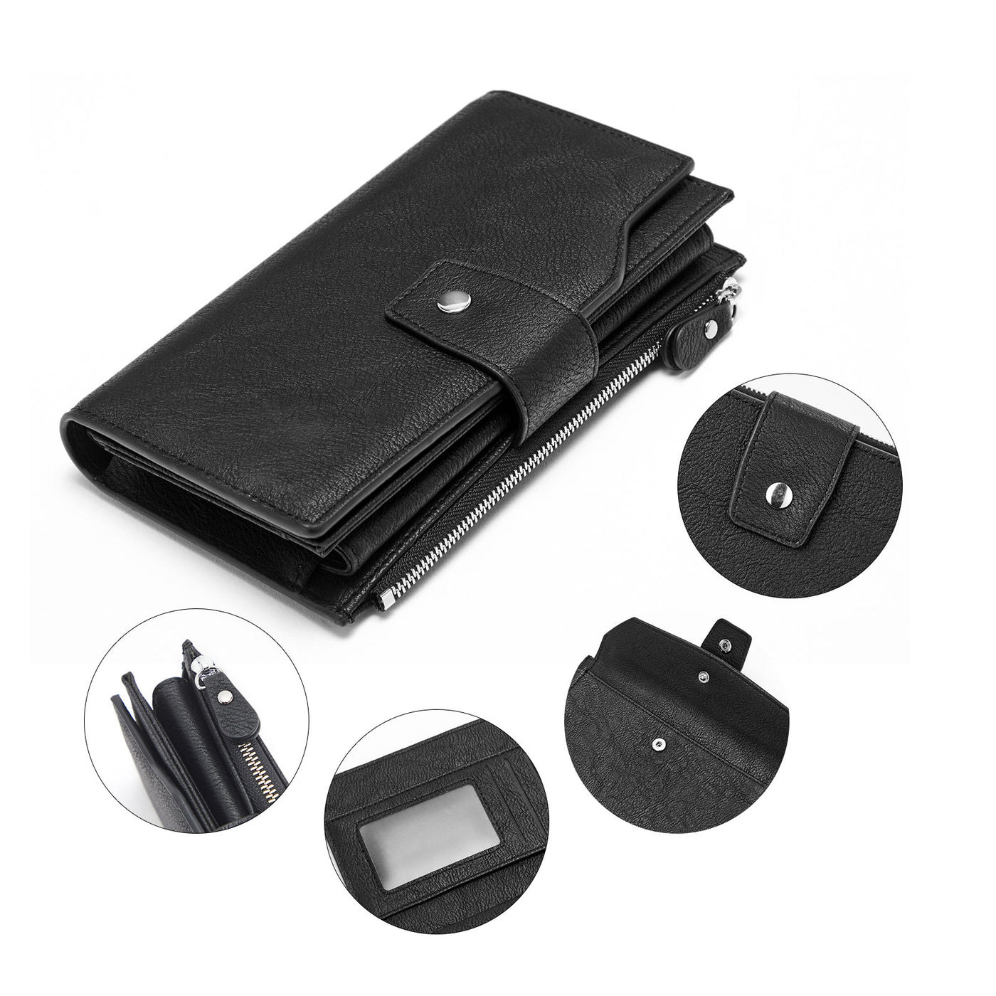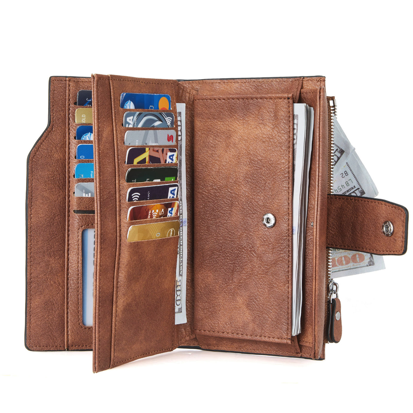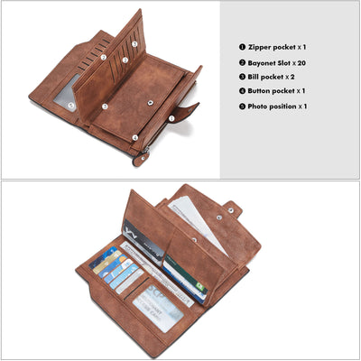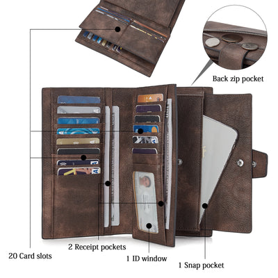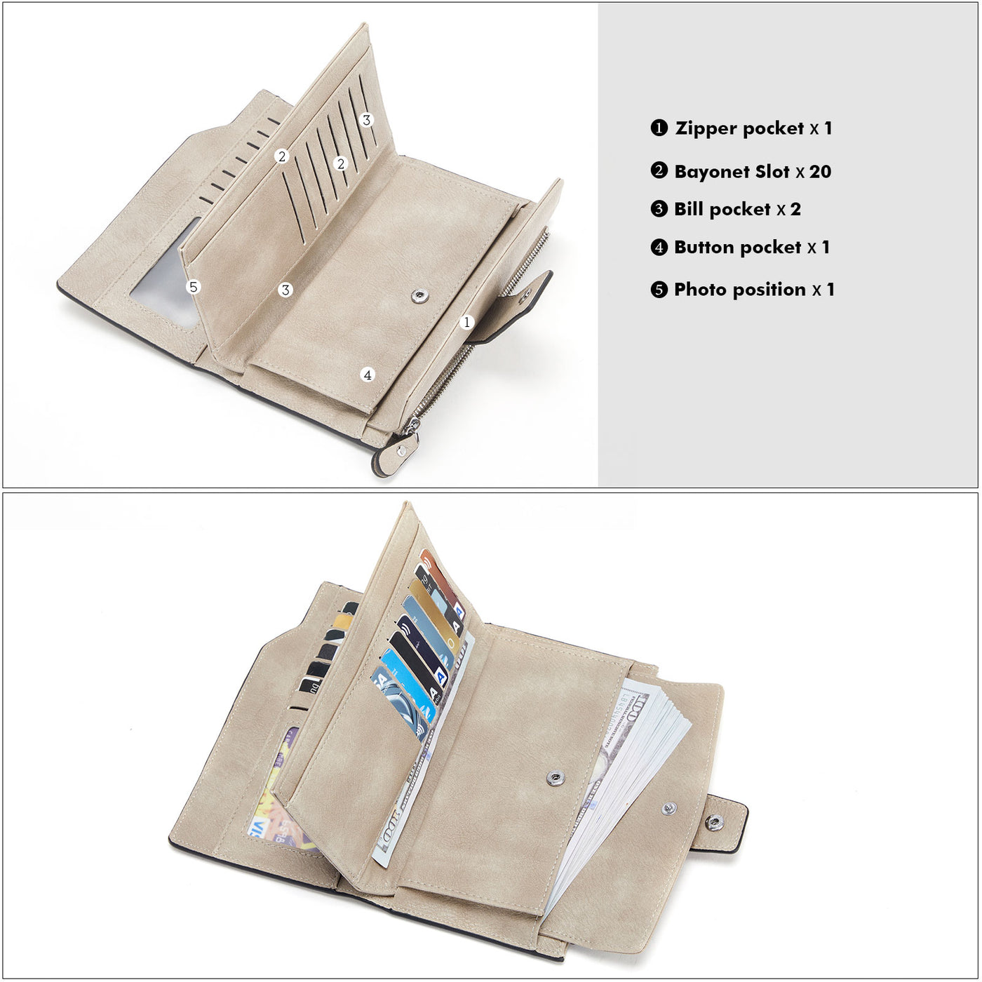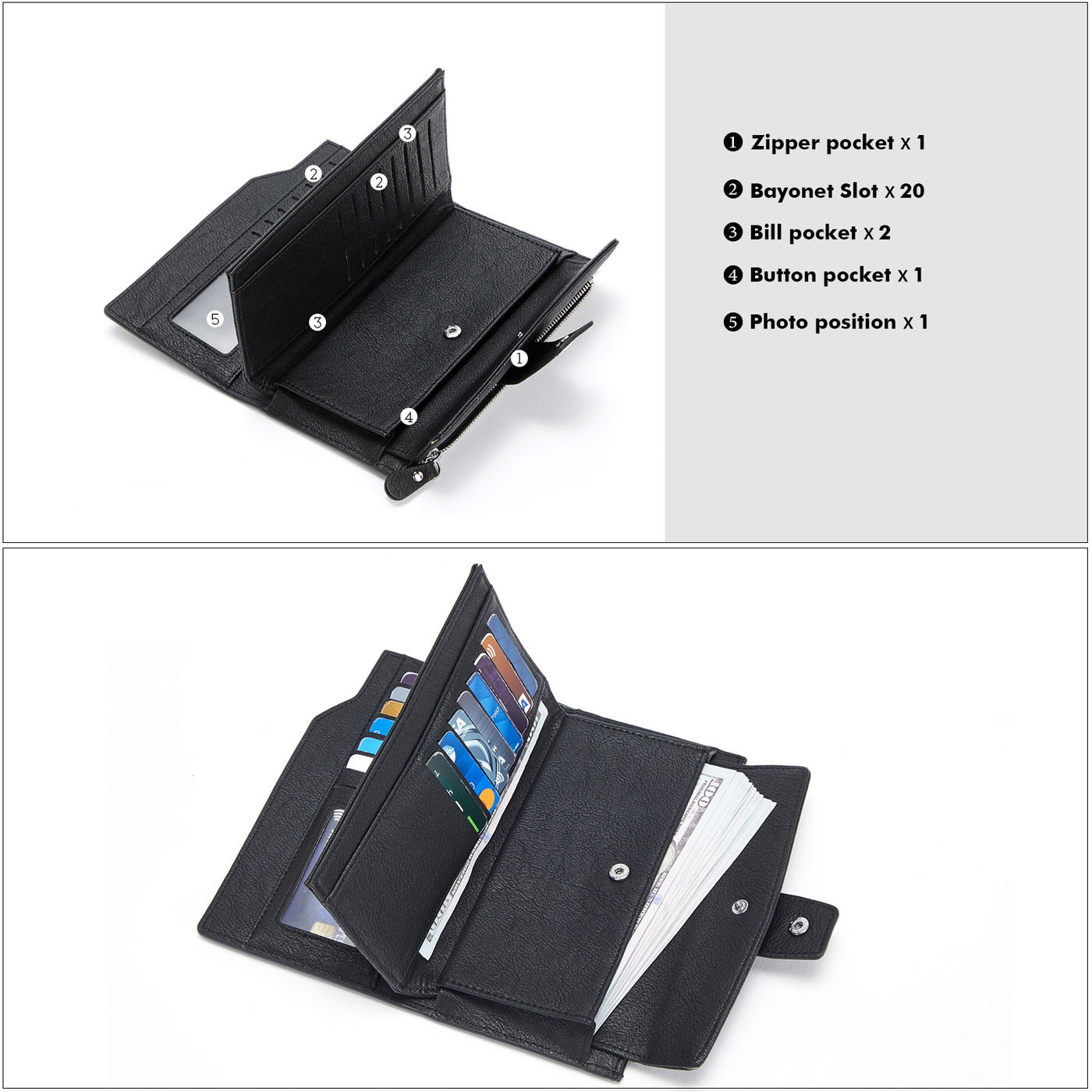 Functional Design - 20 credit card slots, 1 ID window, 1 magnetic buckle pocket, 1 zipper coin pocket, and 9 receipt pockets are enough for your important bills and receipts. Combination of zipper closure and magnetic bottom keeps your money safety. Large capacity design allow this wallet to comfortably hold your cell phone, coin, cash, credit card, and other small things.