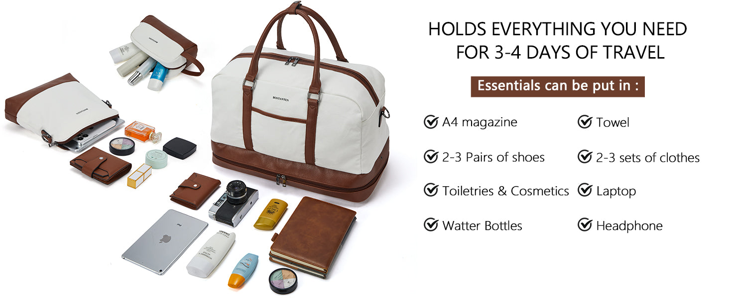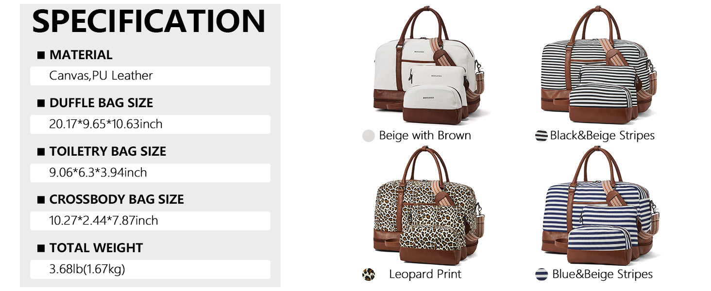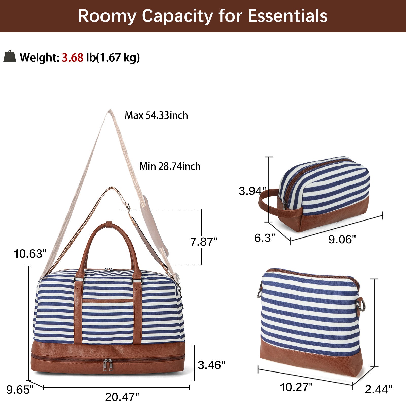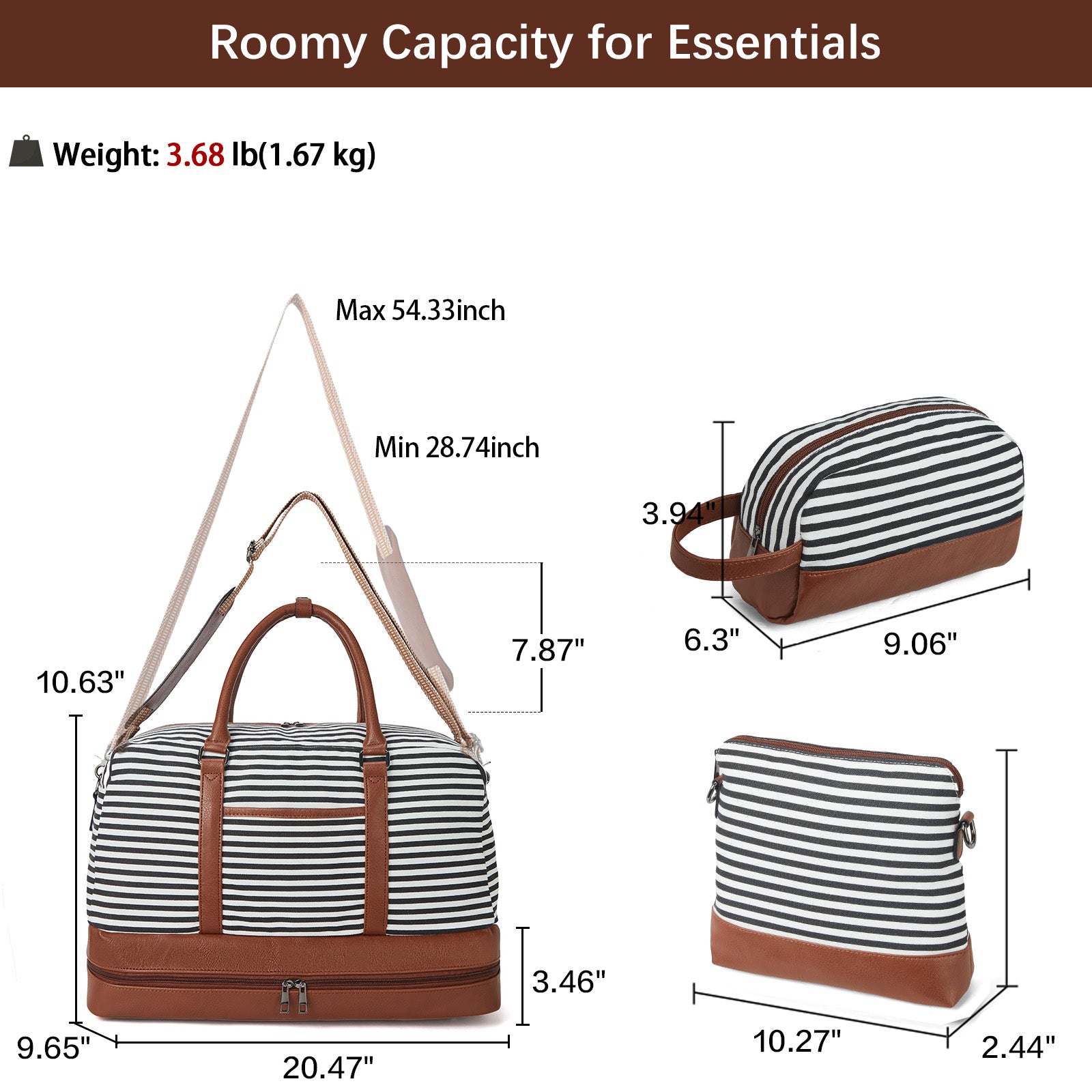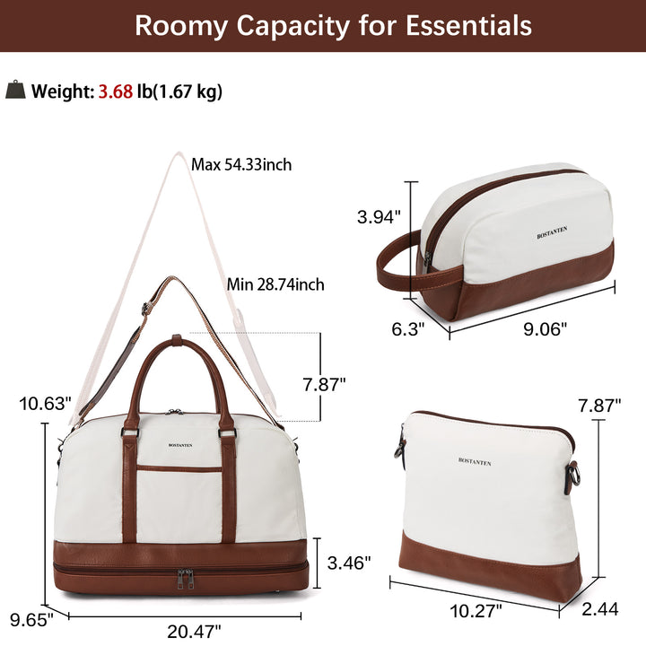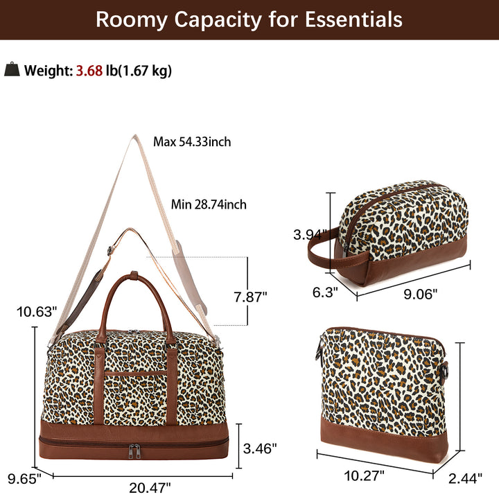 • Large Capacity -- The size of travel bag is 20.47’’(L)*9.65’’(W)*10.63’’(H),3.68 lb weight.Adjustable range of shoulder strap is 28.74''~54.33’’.Extra Crossbody bag: 10.44’’(L)*2.44’’(W)*7.87’’(H), toiletry bag: 9.06’’(L)*6.3’’(W)*3.94’’(H). Here’s the inner structure:1 main compartment,2 slip pockets, and1 zipper pocket. Multiple storage pockets and bags combination are spacious to pack 4~5 days' worth of daily essentials such as clothes, toiletries, makeup, and electronics, perfect for personal or family trips.