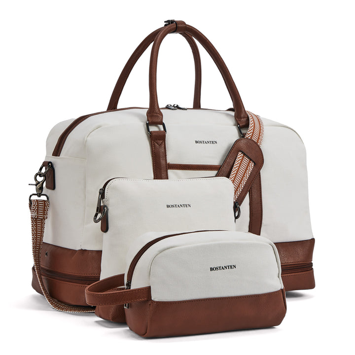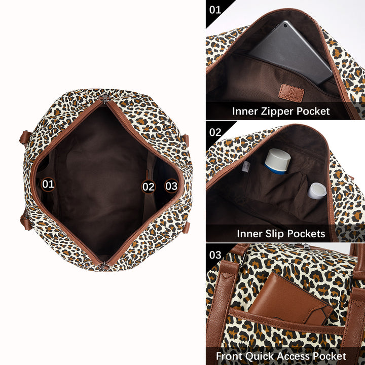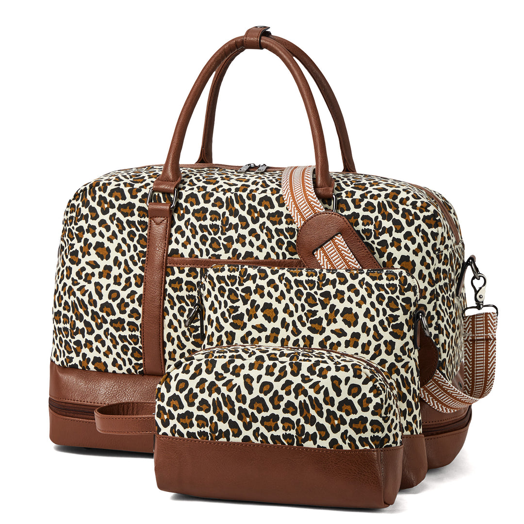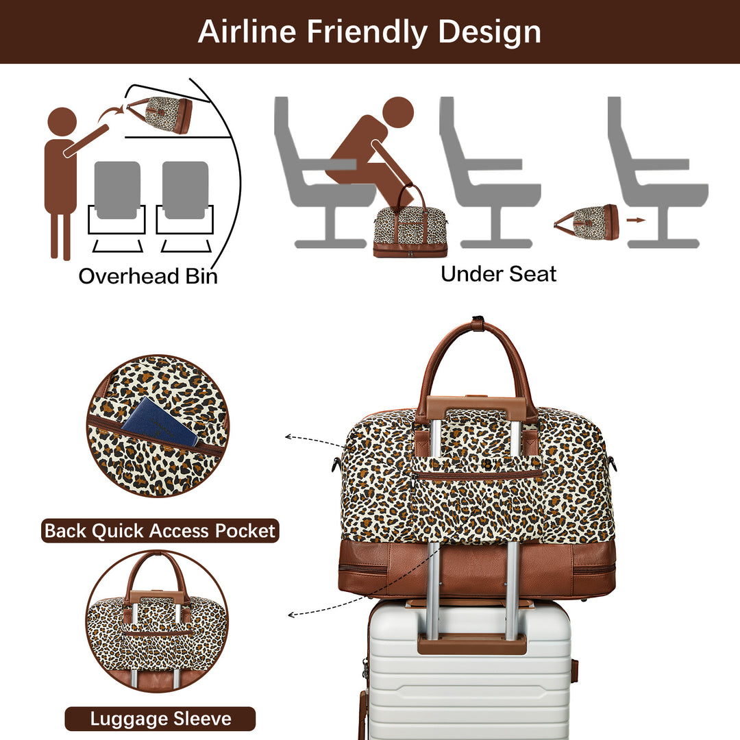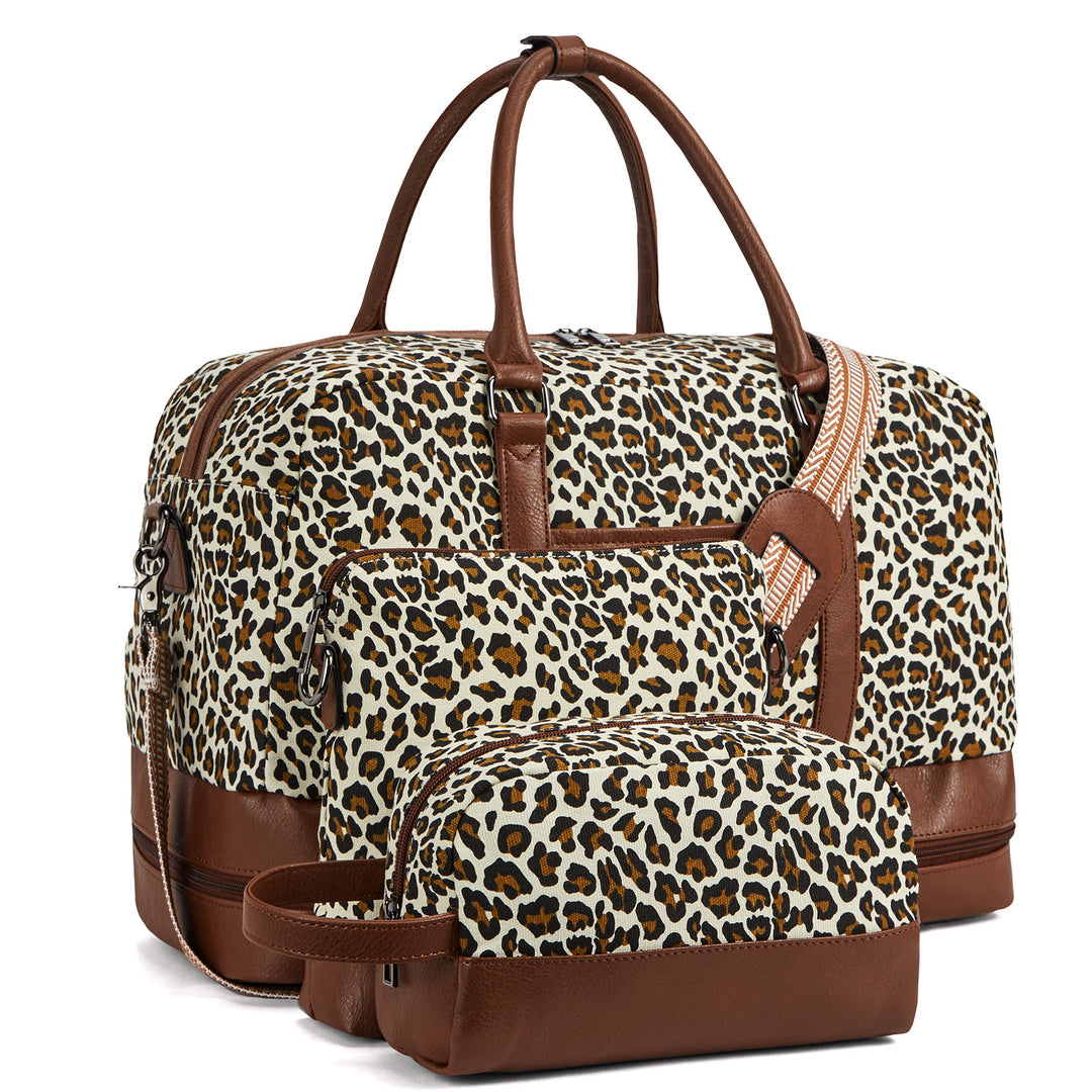 • Large Capacity -- The size of travel bag is 20.47’’(L)*9.65’’(W)*10.63’’(H),3.68 lb weight.Adjustable range of shoulder strap is 28.74''~54.33’’.Extra Crossbody bag: 10.44’’(L)*2.44’’(W)*7.87’’(H), toiletry bag: 9.06’’(L)*6.3’’(W)*3.94’’(H). Here’s the inner structure:1 main compartment,2 slip pockets, and1 zipper pocket. Multiple storage pockets and bags combination are spacious to pack 4~5 days' worth of daily essentials such as clothes, toiletries, makeup, and electronics, perfect for personal or family trips.