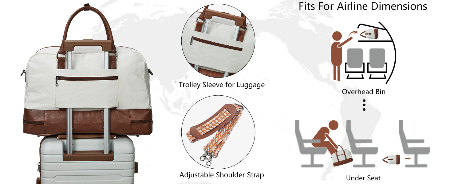 • Shoulder Strap&Luggage Sleeve -- You could attach this duffel bag to a luggage case with the trolley sleeve(8’’ width), which allows you to free up your hands to do other things. The extendable shoulder straps with soft pad can reduce the pressure when you carry it by crossbody. All these designs are only to make your journey and life easier.