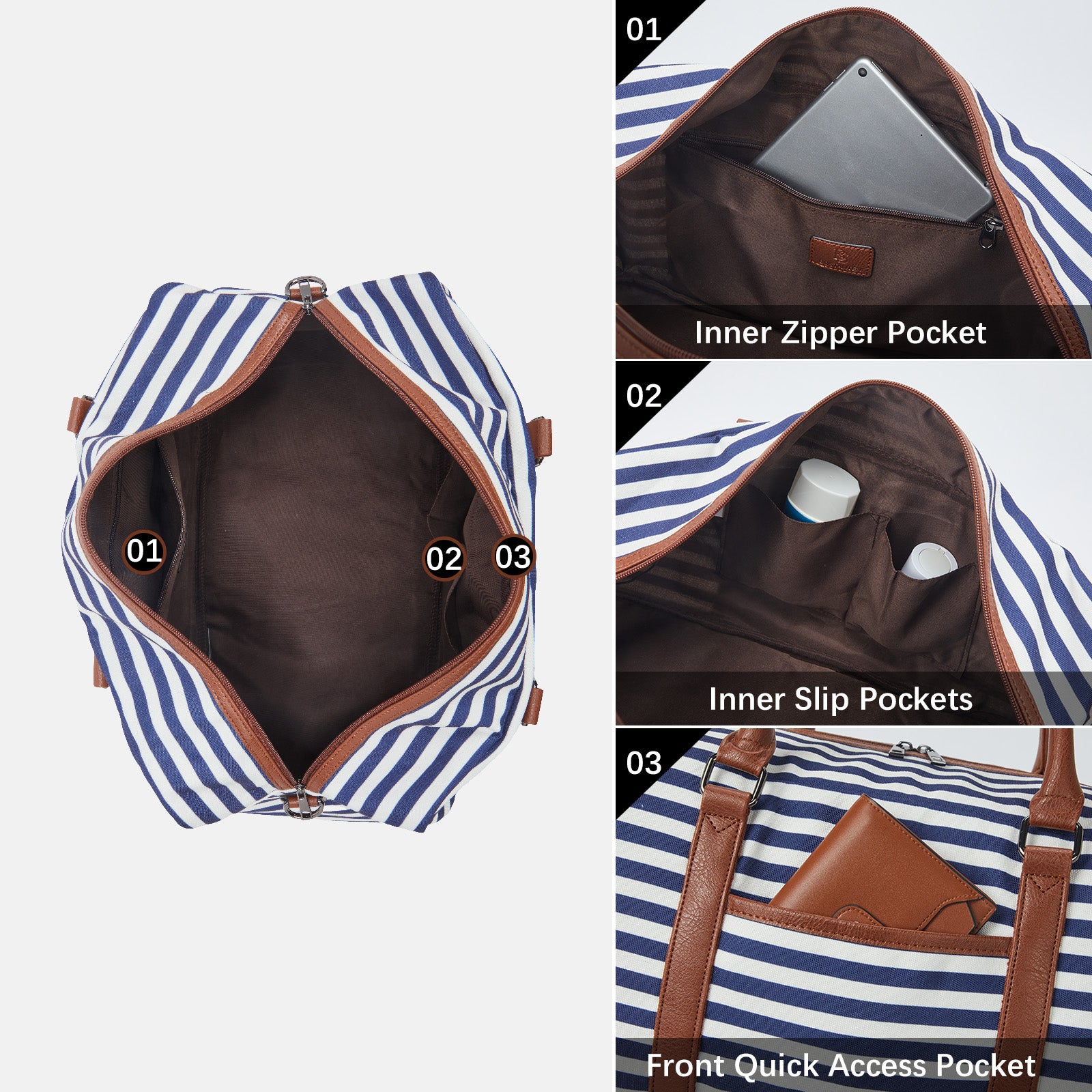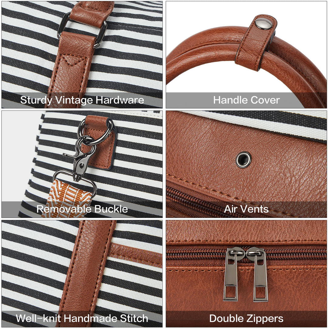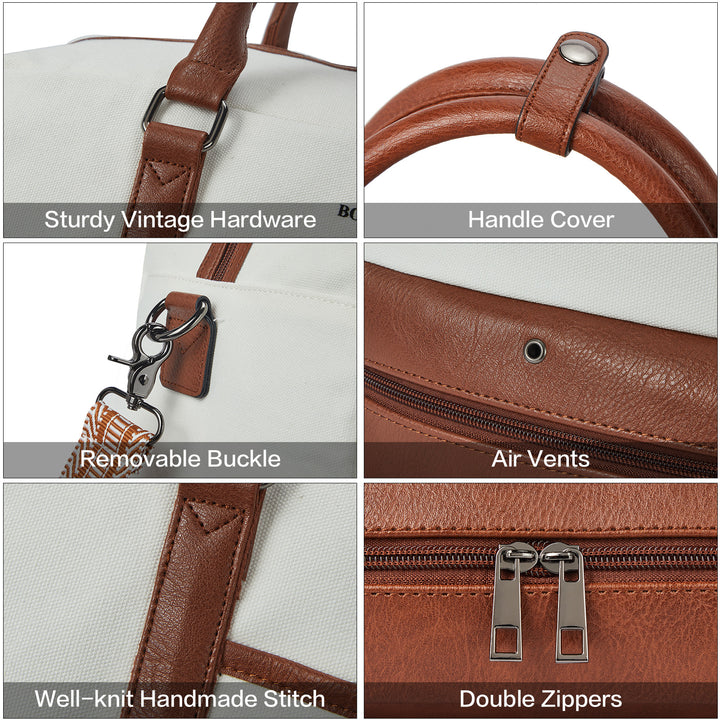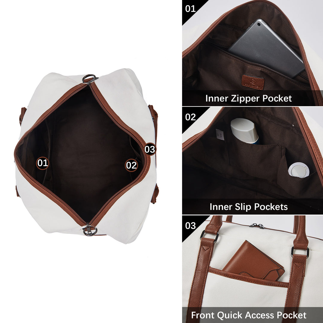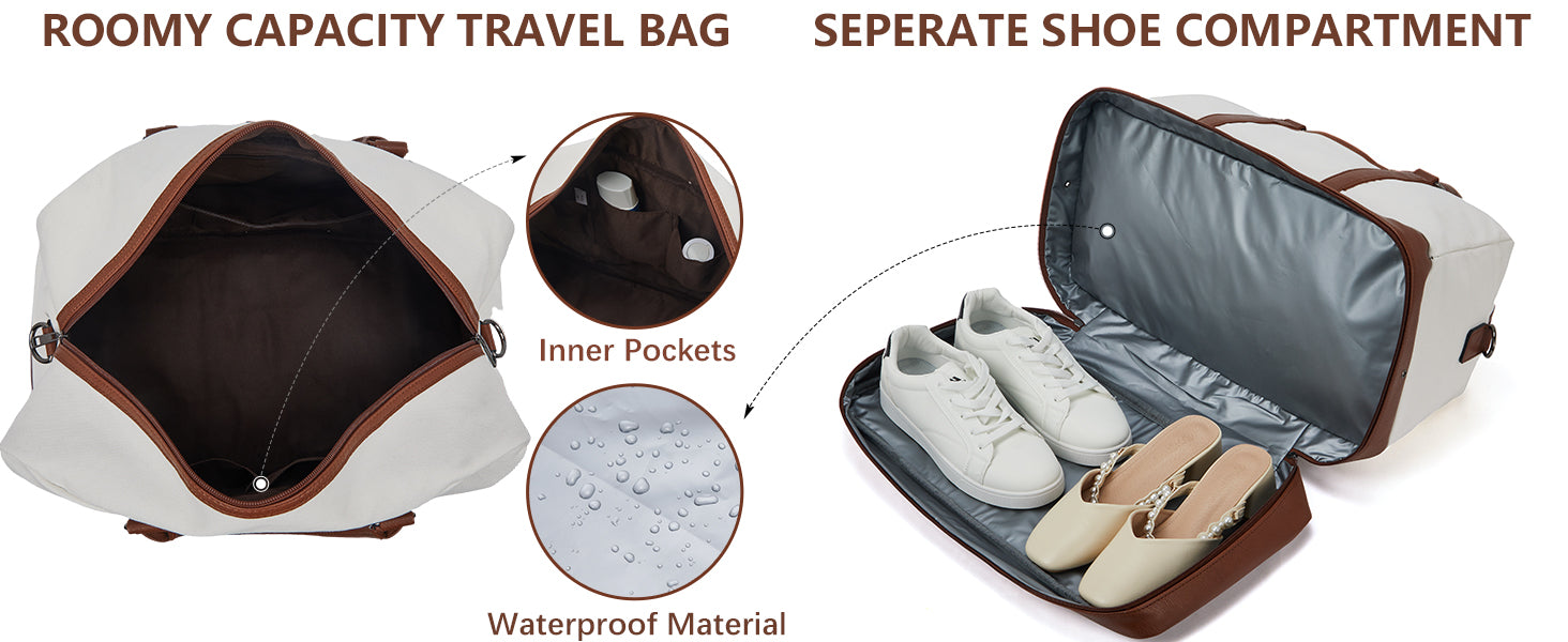 • High-End Material -- This large weekender bag is handmade by a professional craftsman with high-quality canvas, soft khaki fabric lining, and sturdy hardware. Well-knit stitches make it bear heavier items without tearing. Classic color combinations make it stylish, and also easy to match most outfits and occasions.