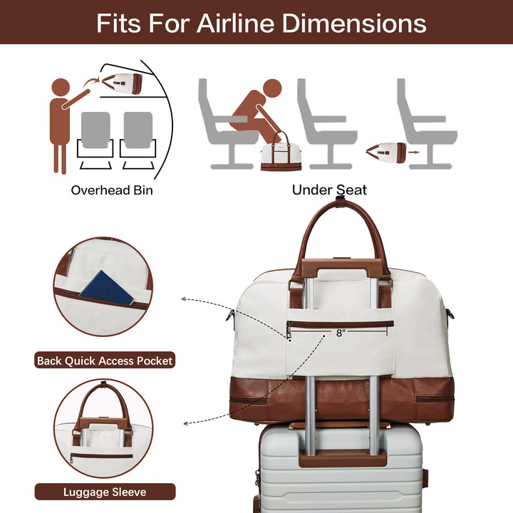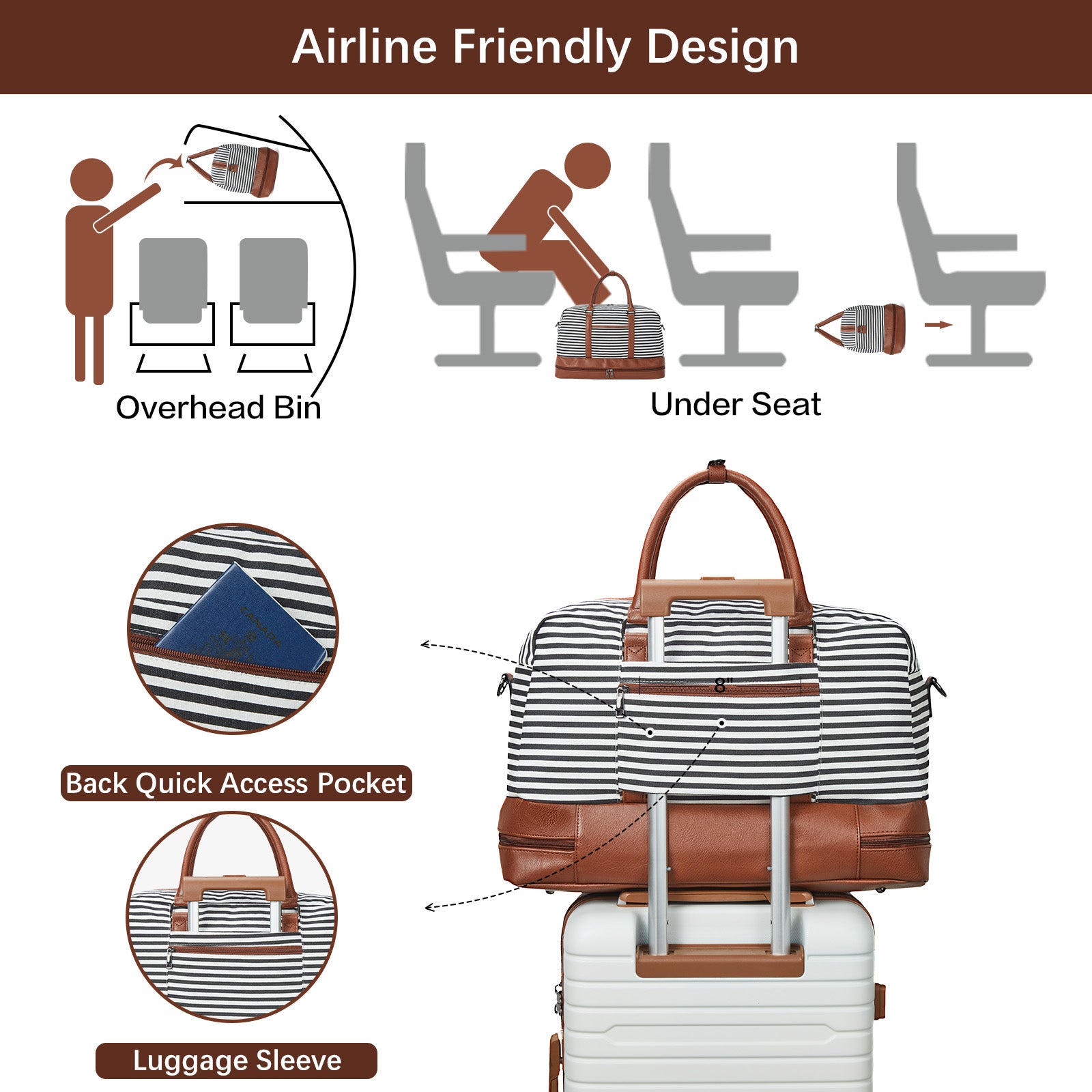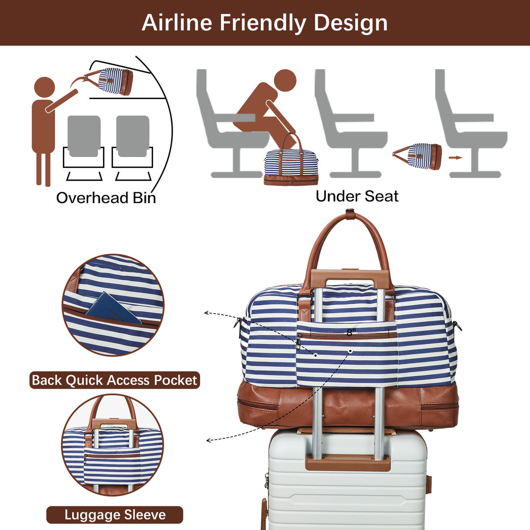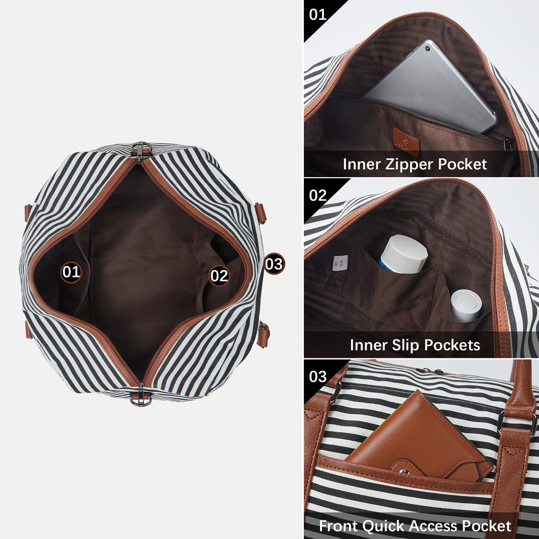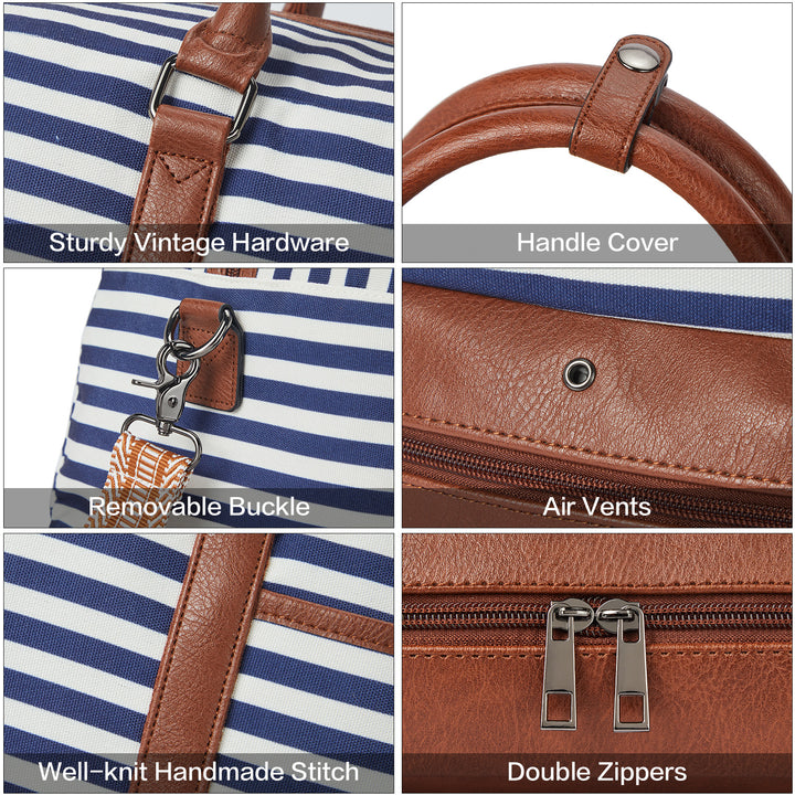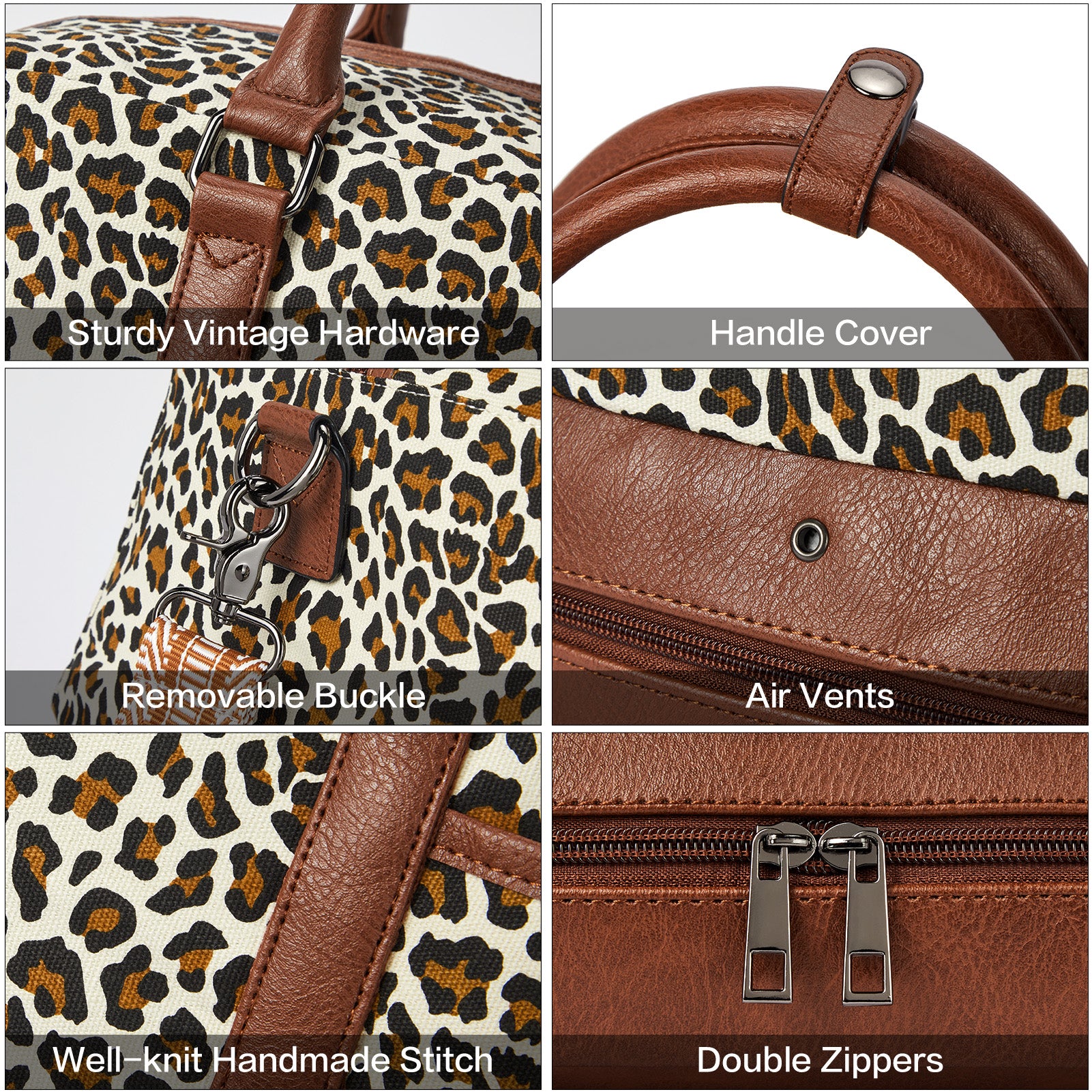 • High-End Material -- This large weekender bag is handmade by a professional craftsman with high-quality canvas, soft khaki fabric lining, and sturdy hardware. Well-knit stitches make it bear heavier items without tearing. Classic color combinations make it stylish, and also easy to match most outfits and occasions.